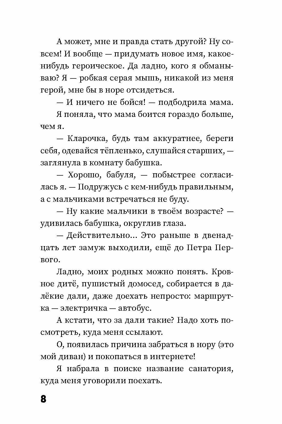 Клара - двенадцатилетний домосед - впервые в жизни уезжает из дома на целый месяц. Она отправляется в санаторий. Корпус стоит на высокой горе, которую окружают Чёрный лес, солёная река Усолка и три других горы: Медная, Железная и Стеклянная. Похоже на зачин какой-то сказки - и явно недоброй. Предчувствия не подводят: в палате её соседками оказываются Ягишна, Однорукая, Плешивая, а по коридорам снуют злющие медсёстры - Годзилла с Круэллой… Но Клара справится со всеми испытаниями - и приобретёт настоящих, верных друзей.