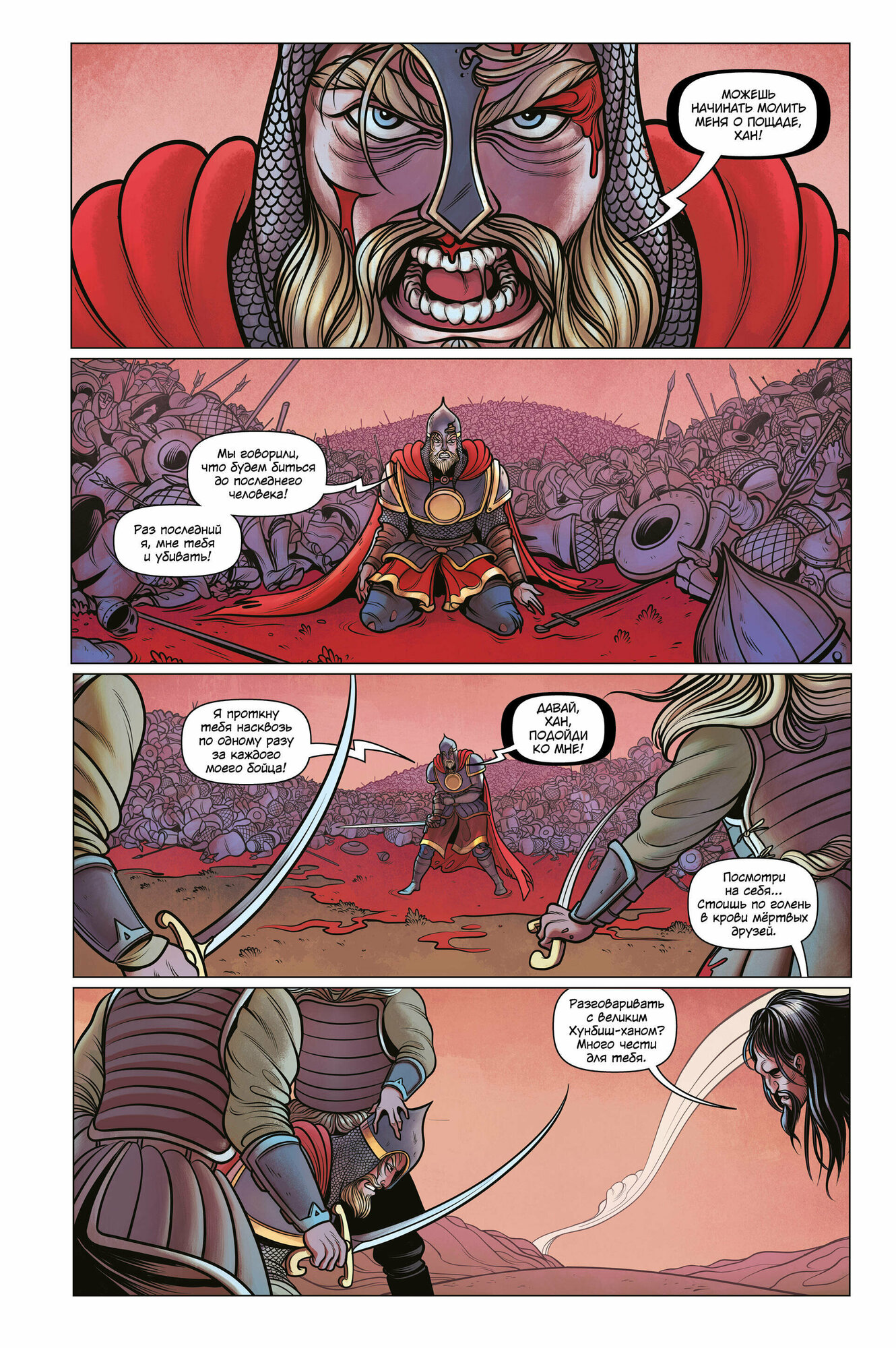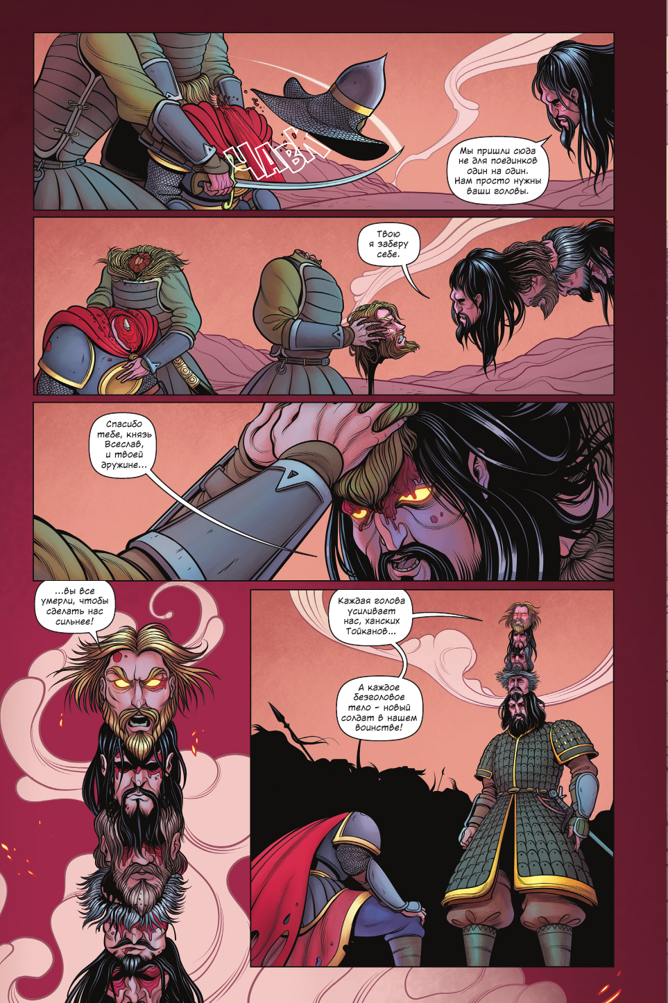 Просится увеличенный формат: рубилово и изобилие болванчиков к этому располагает. Бумагу в 20-страничном сингле за 200 рябчиков я бы хотел поплотнее: очень уж тонкая. Корректура отсутствует как таковая. Диалоги избыточны (два раза подряд одно и то же), на живую речь похожи далеко не всегда, да и можно было стилизовать под старую речь, при этом не сильно потеряв в понимаемости. Плюс есть небольшой вопрос по части сюжета ближе к концу, но без спойлера о нём упомянуть нельзя, поэтому не буду. Тем не менее, повторюсь, было интересно. А большинства — если не всех — упомянутых выше недочётов по части текста рядовой читатель, работа которого с дрессировкой бук0в не связана, не заметит. Так что, если привлекло превью и не отпугнула цена, брать можно. Если что, вполне реален шанс, что сбагрить через пару лет можно будет за ту же цену, что и возьмёте сейчас. -