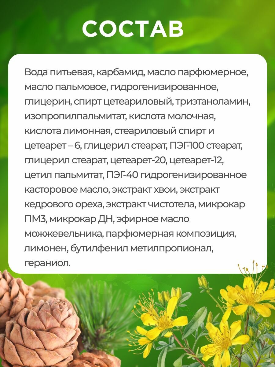 | Состав | Aqua, Urea, Paraffinum Liquidum, Hydrogenated Palm Oil, Glycerin, Cetearyl Alcohol, Triethanolamine, Isopropyl Palmitate, Lactic Acid, Citric Acid, Stearyl Alcohol, Ceteareth-6, Glyceryl Stearate, PEG-100 Stearate, Ceteareth-20, Ceteareth-12, Cetyl Palmitate, PEG-40 Hydrogenated Castor Oil, Abies Sibirica Needle Extract, Pinus Sibirica Seed Oil, Chelidonium Majus Extract, Phenoxyethanol, Methylparaben, Ethylparaben, Propylparaben, DMDM Hydantoin, Juniperus Communis Wood Oil, Parfum, d-Limonene, Butylphenyl Methylpropional, Geraniol. |
