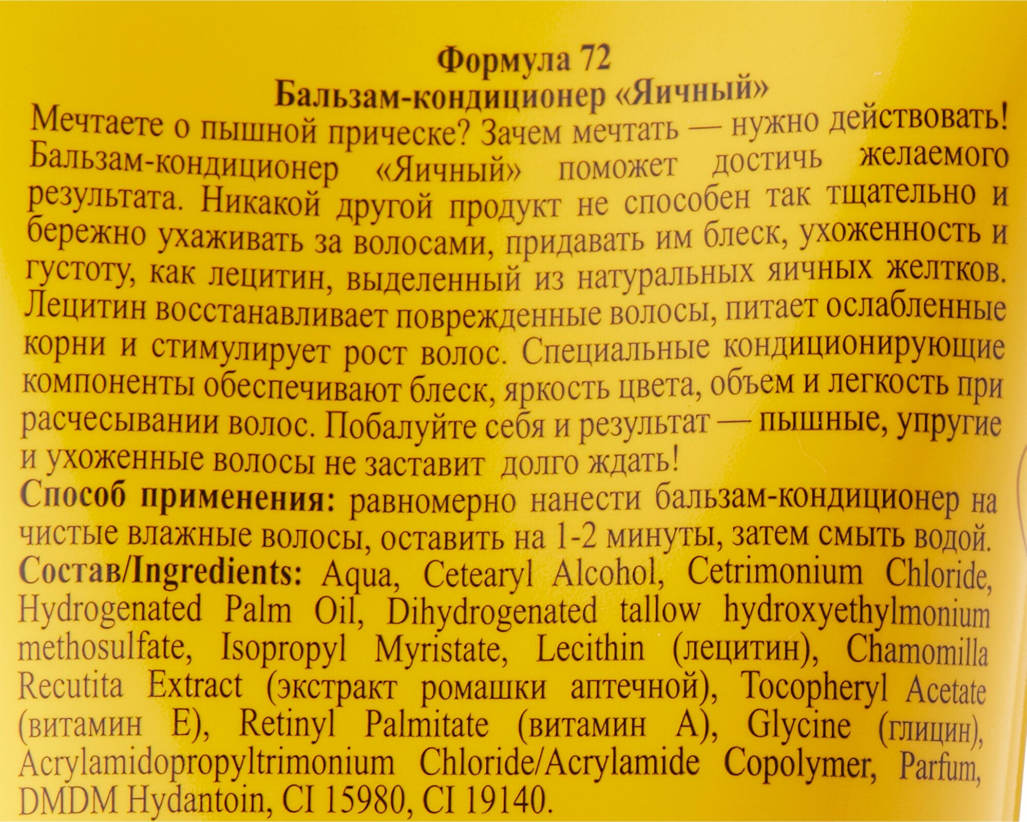 Бальзам-кондиционер Яичный поможет достичь желаемого результата. Никакой другой продукт не способен так тщательно и бережно ухаживать за волосами, придавать им блеск, ухоженность и густоту, как лецитин, выделенный из желтка перепелиных яиц. Лецитин восстанавливает поврежденные волосы, питает ослабленные корни и стимулирует рост волос. Специальные кондиционирующие компоненты обеспечивают блеск, яркость цвета, объем и легкость при расчесывании волос. Побалуйте себя и результат — пышные, упругие и ухоженные волосы не заставит долго ждать!Эффект:восстанавливает поврежденные волосы;питает ослабленные корни;обеспечивает легкость расчесывания.Способ применения: равномерно нанести бальзам-кондиционер на чистые влажные волосы, оставить на 1-2 минуты, затем смыть водой.Состав: Aqua, Cetearyl Alcohol, Cetrimonium Сhloride, Cocos Nucifera Oil, Dipalmitoylethyl Hydroxyethylmonium Methosulfate, Ceteareth-