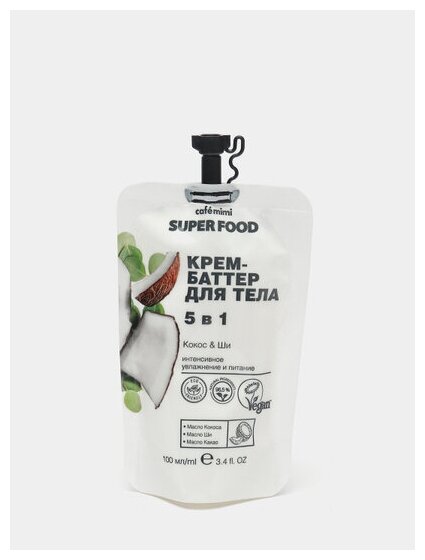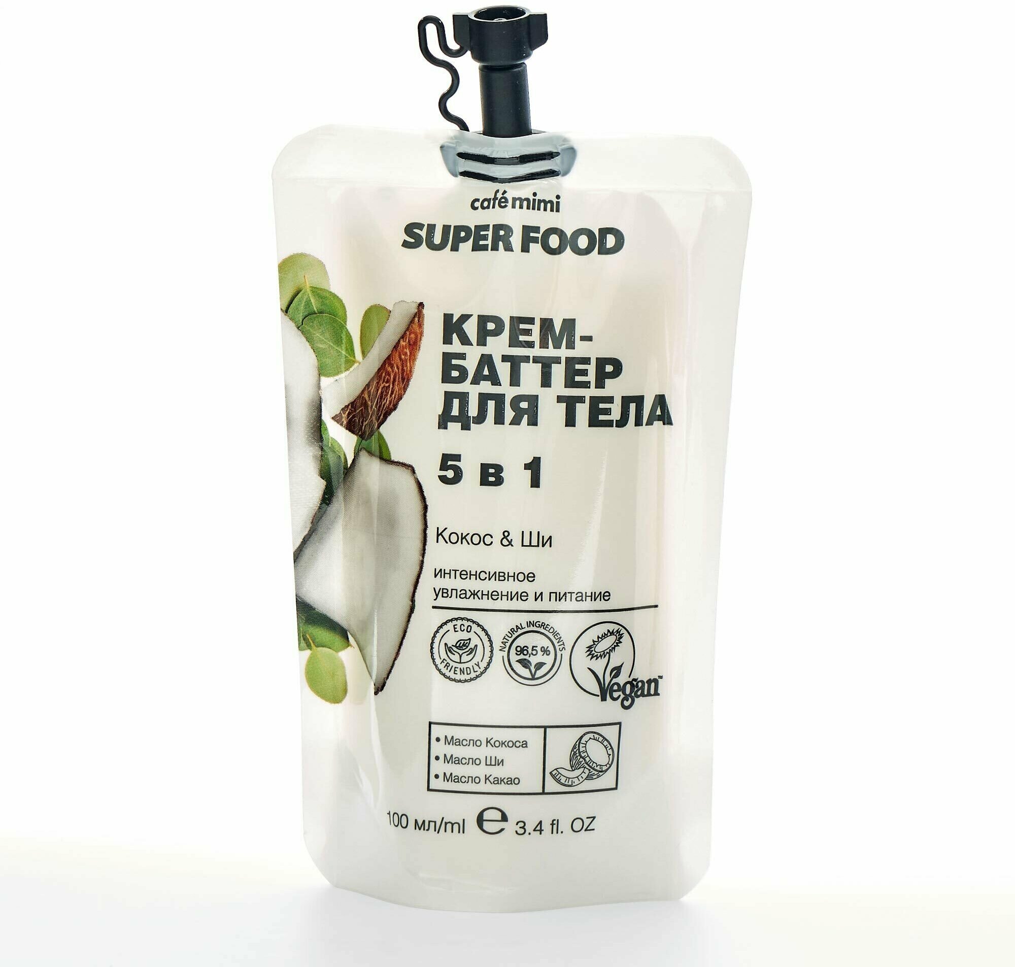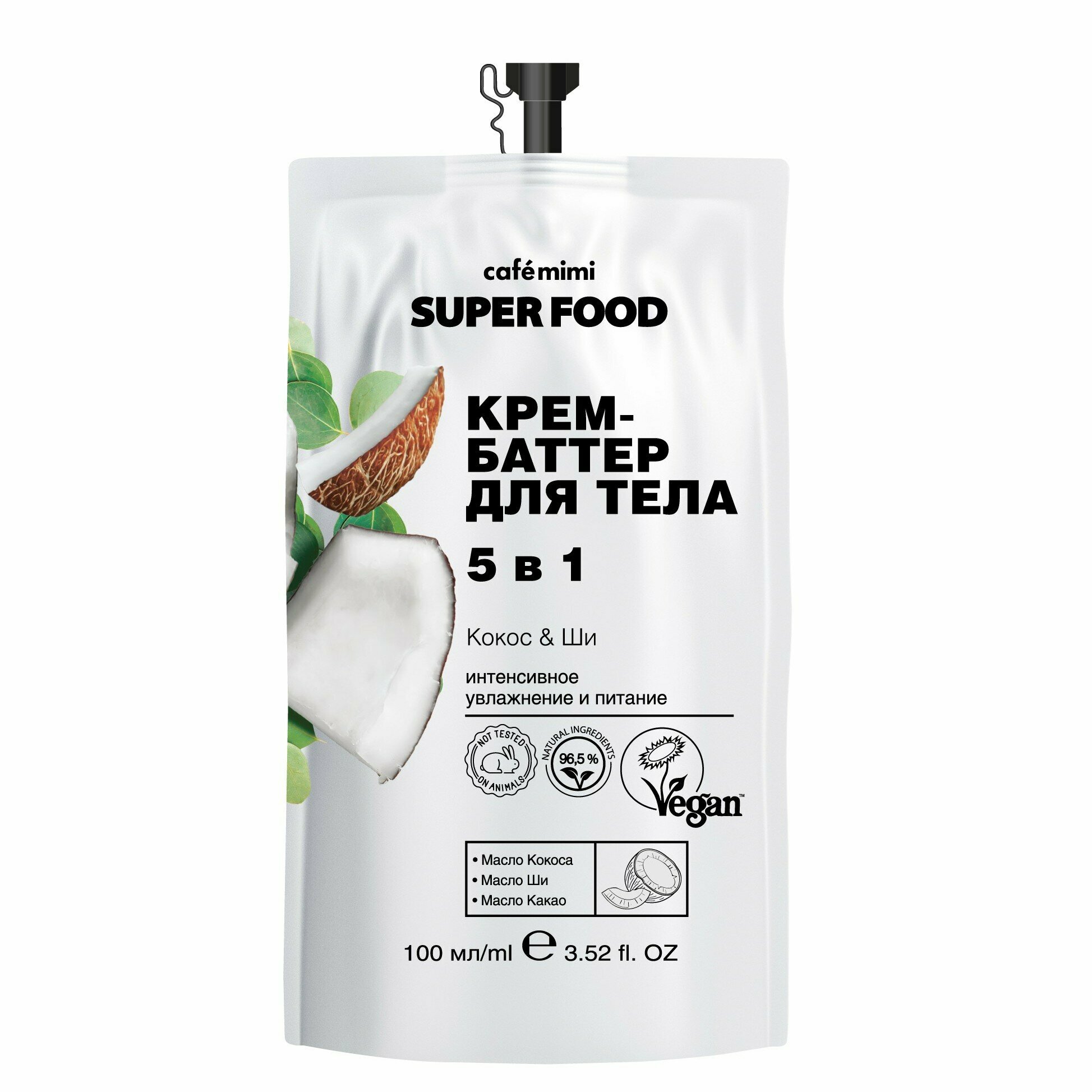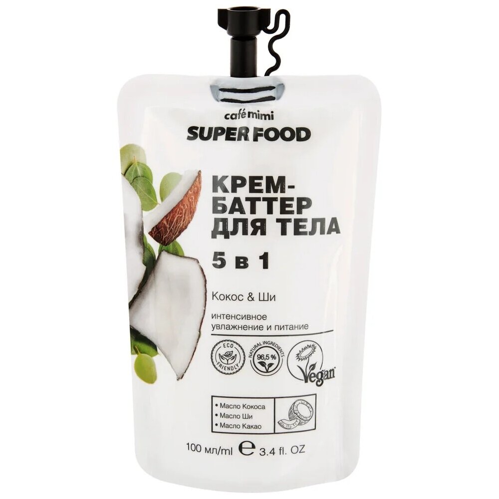 Крем-баттер для тела Cafe Mimi Super Food 5 в 1 Кокос, Ши (100 мл) — это средство для ухода за кожей.