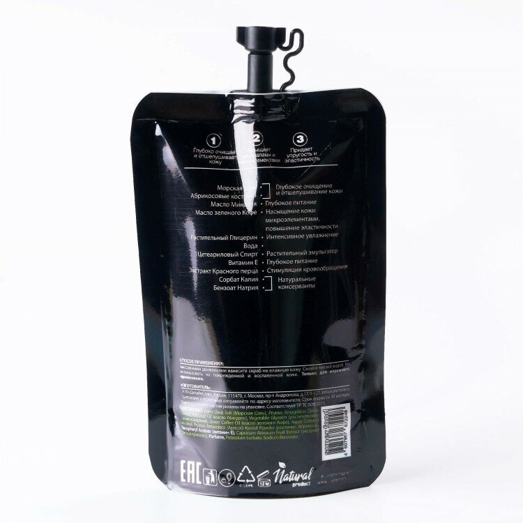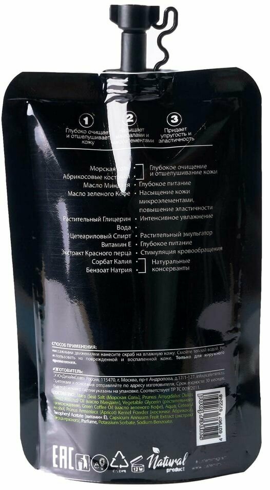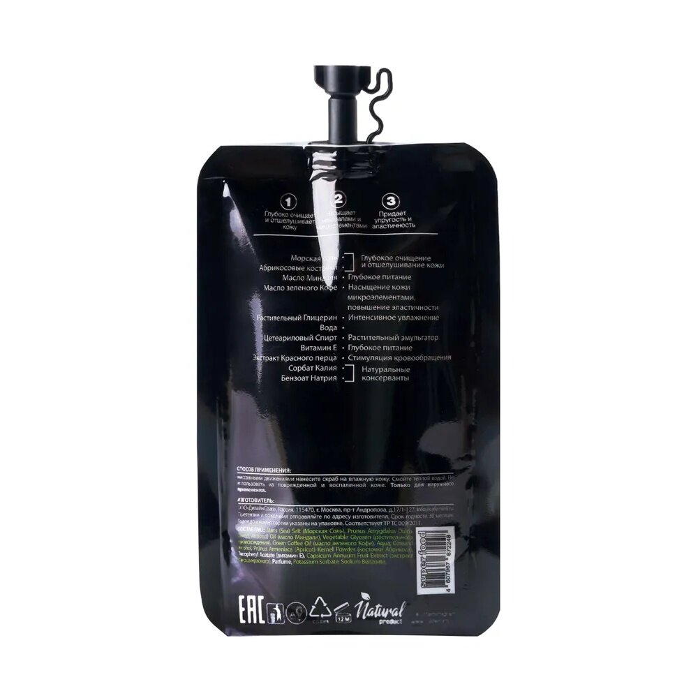 | Состав | Maris (Sea) Salt (Морская Соль), Prunus Amygdalus Dulcis (Sweet Almond) Oil (масло Миндаля), Vegetable Glycerin (растительного происхождения), Green Coffee Oil (масло зеленого Кофе), Aqua, Cetearyl Alcohol, Pr?nus Armen?aca (Apricot) Kernel Powder (косточки Абрикоса), Tocopheryl Acetate (витамин Е), Vanillyl Butyl Ether, Parfume, Potassium Sorbate, Sodium Benzoate |