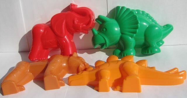 Формы для песка: ископаемый мамонт (13,5х10 см) + динозавр Трицерапторс (16,5х10 см) + динозавр Стегозавр(19х8,5 см) + саблезубый тигр (16,5х10 см). Игрушки изготовлены из яркого крепкого пластика высочайшего качества. Играя такими формами для песка Ваш малыш сможет познакомиться с древними ископаемыми жителями Земли. Вы сможете поиграть с ребенком: сделать кулич и назвать то животное, которое получилось. А еще можно рассказать историю про это животное. Например, про формочку мамонта можно рассказать историю о мамонтенке, который искал маму. Наверняка дома у ребенка есть книжки о динозаврах и их фигурки, поэтому ребенок будет слышать знакомые слова и сопоставлять их, развивая ассоциативное мышление. В наборе есть динозавр Стегозавр (с треугольными наростами гребнями по всему хребту) и динозавр Трицерапторс (с рогом и защитным воротником). Вы можете рассказать ребенку, как назывались эти динозавры и разобрать с ним, какие у них внешние отличия. Очень редкая формочка - саблезубый тигр. Правда, что-то знакомое в названии? Где же упоминаются эти животные? Конечно же в сказке А. М. Волкова "Волшебник изумрудного города". Помните, когда в одном из эпизодов Элли с друзьями пришлось пройти через лес с этими зверями? "За оврагом по обеим сторонам дороги потянулся ещё более угрюмый лес, и стало темно. Из зарослей послышалось глухое сопение и протяжный рёв. Путникам стало жутко, а Тотошка совсем запутался в ногах у Льва, считая теперь, что Лев сильнее Железного Дровосека. Трусливый Лев сообщил спутникам, что в этом лесу живут саблезубые тигры. - Что это за звери? - осведомился Железный Дровосек. - Это страшные чудовища, - боязливо прошептал Лев. - Они куда больше обыкновенных тигров, живущих в других частях страны. У них из верхней челюсти торчат клыки, как сабли. Такими клыками эти тигры могут проколоть меня, как котёнка… Я ужасно боюсь саблезубых тигров… Все сразу притихли и стали осторожнее ступать по желтым кирпичам. Элли сказала шепотом: - Я читала в книжке, что у нас в Канзасе саблезубые тигры водились в древние времена, но потом все вымерли, а здесь, видно, живут до сих пор… - Да вот живут, к несчастью, - отозвался Трусливый Лев. - Я увидел одного издалека, так три дня болел от страха…"Прочитайте ребенку эту книжку, о том, как друзьям удалось спастись от саблезубых тигров. Это будут для него незабываемые ощущения. И теперь, лепя куличики формочкой, Ваш ребенок будет делать это с новым смыслом и особым интересом. Вспоминая рассказ, он будет фантазировать и воспроизводить его сюжет.