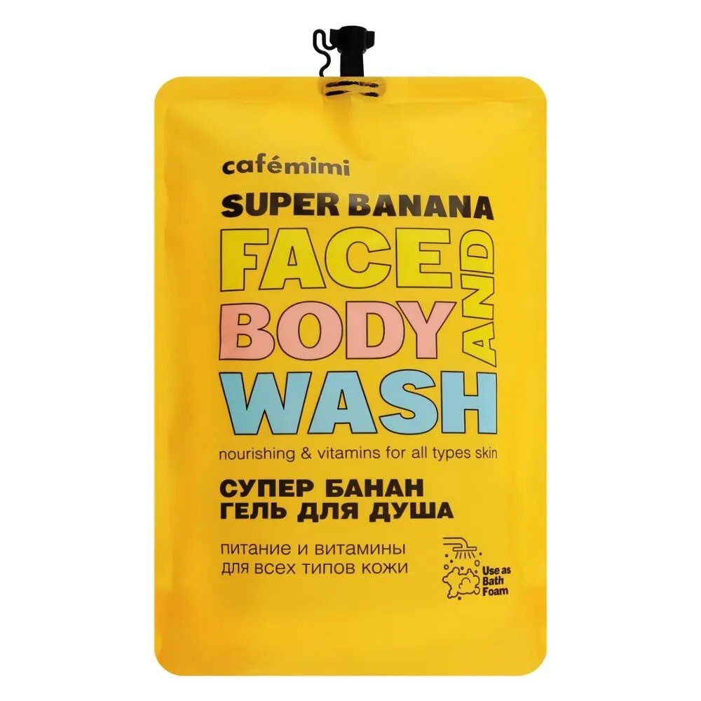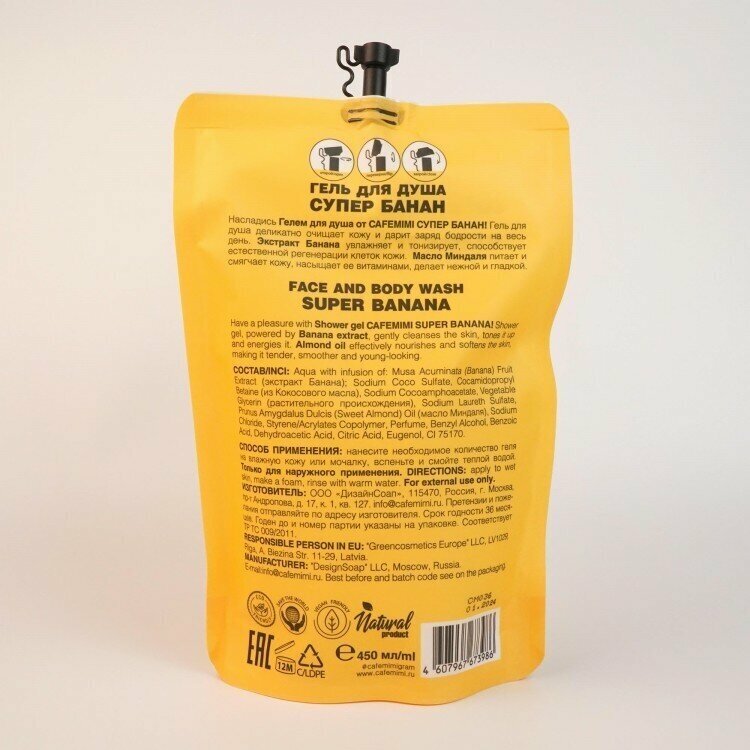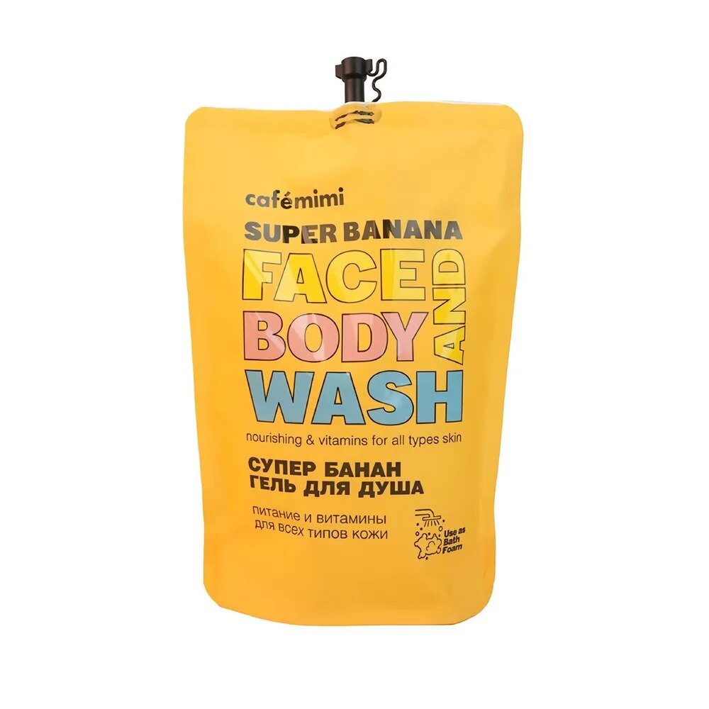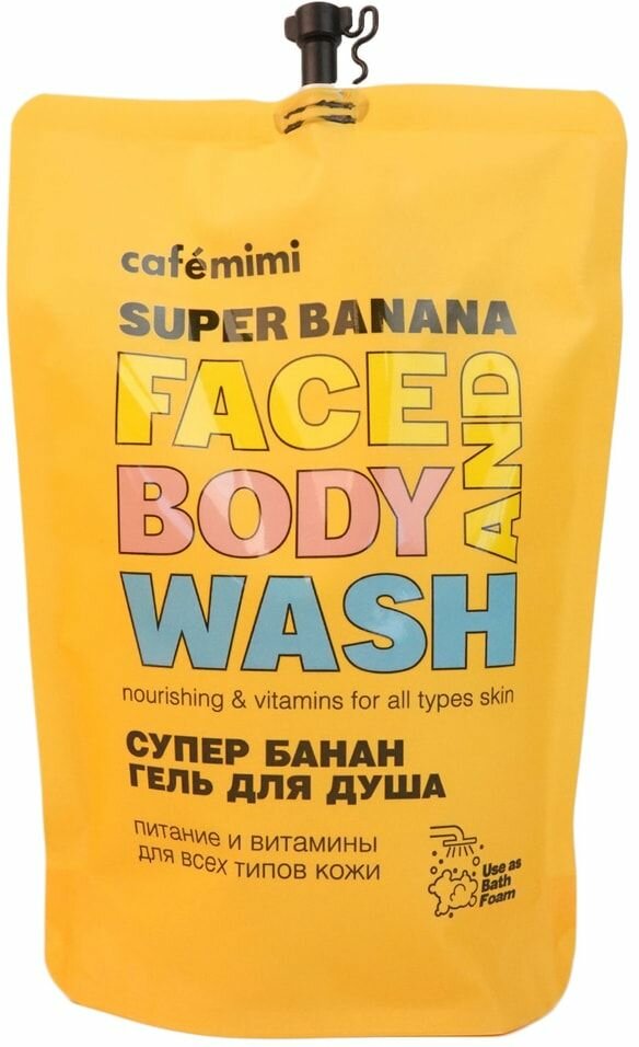 Cafemimi Гель для душа Супер банан (сменный блок) 450 мл - деликатно очищает кожу и дарит заряд бодрости на весь день. Экстракт Банана увлажняет и тонизирует, способствует естественной регенерации клеток кожи. Масло Миндаля питает и смягчает кожу, насыщает ее витаминами, делает нежной и гладкой. Нанесите необходимое количество геля на влажную кожу или мочалку, вспеньте и смойте теплой водой. Только для наружного применения. Состав: Aqua with infusion of: Musa Acuminata (Banana) Fruit Extract (экстракт Банана); Sodium Coco Sulfate, Cocamidopropyl Betaine (из Кокосового масла), Sodium Cocoamphoacetate, Vegetable Glycerin (растительного происхождения), Sodium Laureth Sulfate, Prunus Amygdalus Dulcis (Sweet Almond) Oil (масло Миндаля), Sodium Chloride, Styrene/Acrylates Copolymer, Perfume, Benzyl Alcohol, Benzoic Acid, Dehydroacetic Acid, Citric Acid, Eugenol, CI 75170.