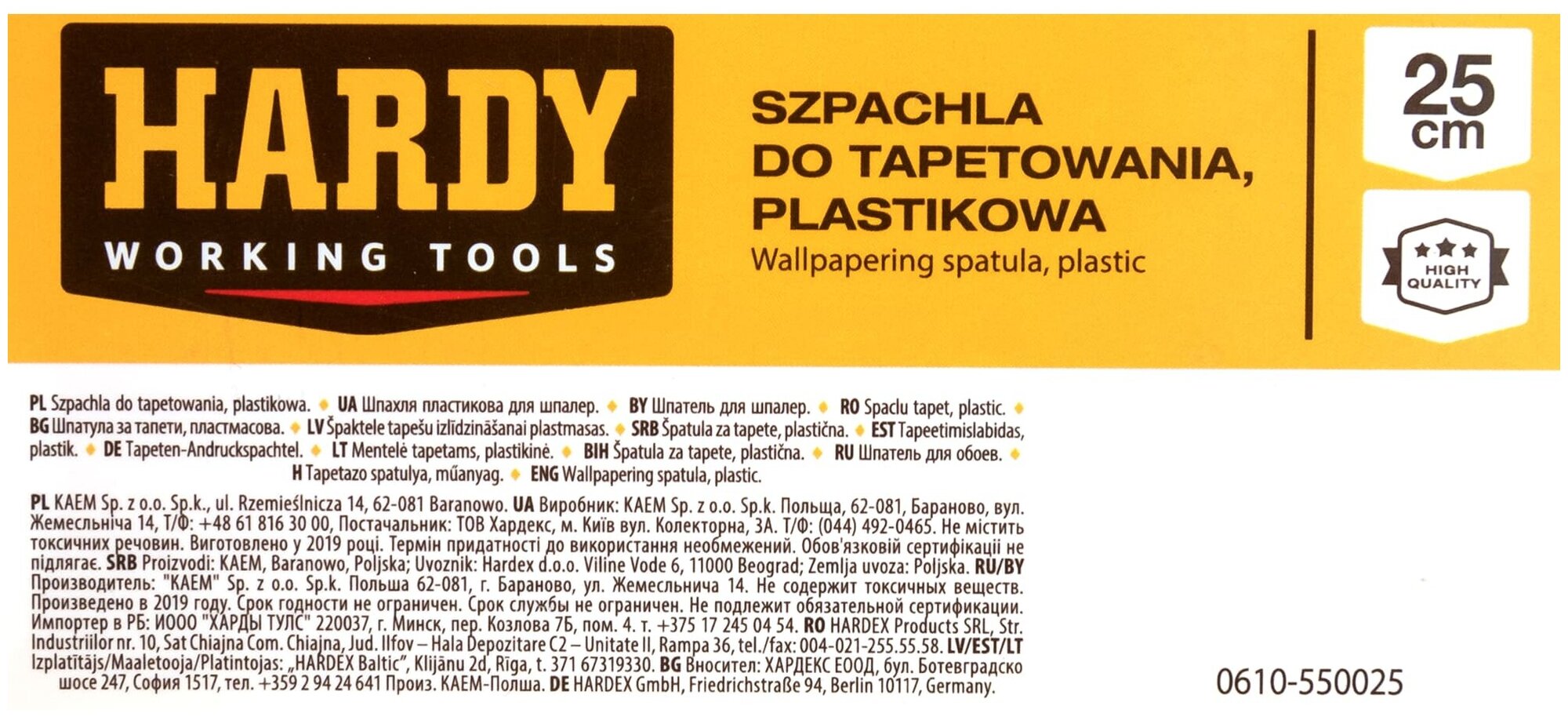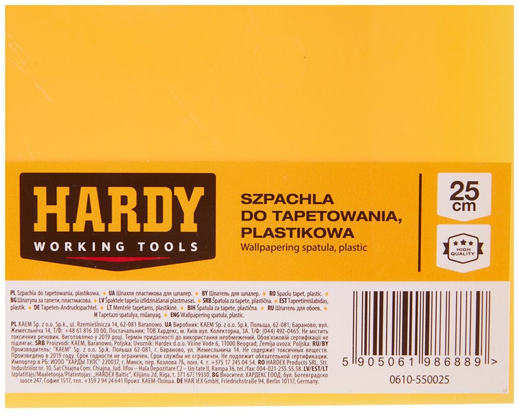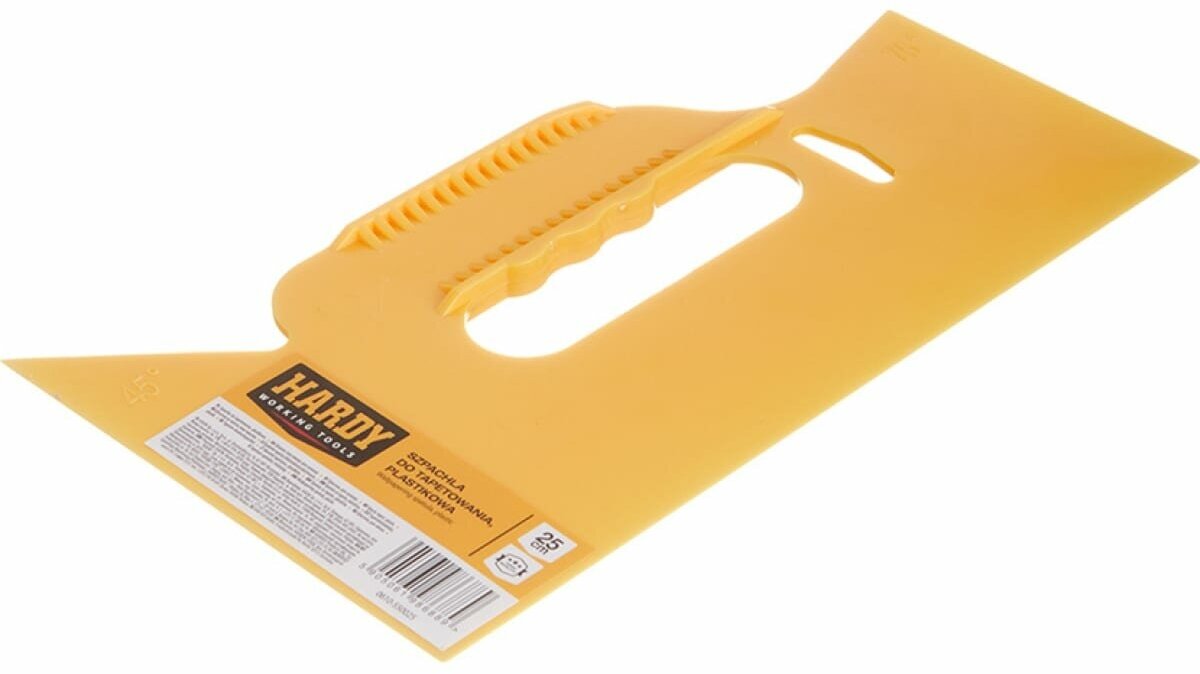 Шпатель для обойных работ выполнен из пластика. Он выполняет прижимную функцию для разглаживания шпалер при поклейке их на стены. Выполнен в желтой цветовой гамме. Встроенная рукоятка с эргономичной формовкой под пальцы обеспечивает удобный хват при длительных работах.Особенности:длина рабочей поверхности — 250 мм.Шпатель для обойных работ из пластика, 250 мм**Шпатель для обойных работ Hardy** выполнен из пластика. Он выполняет прижимную функцию для разглаживания шпалер при поклейке их на стены. Выполнен в желтой цветовой гамме. Встроенная рукоятка с эргономичной формовкой под пальцы обеспечивает удобный хват при длительных работах.### Особенности:- длина рабочей поверхности u2014 250 мм.