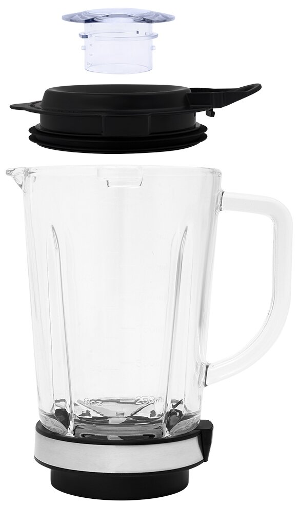 Чаша блендера ёмкостью 1,5 л выполнена из прочного стекла. В крышке блендера есть отверстие для добавления ингредиентов во время работы. Устройство легко разбирается и позволяет тщательно промывать его детали.