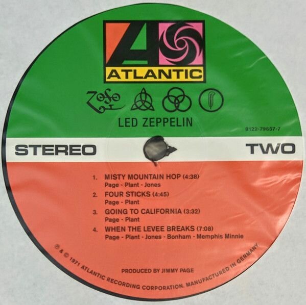 Led Zeppelin IV - четвёртый студийный альбом британской рок-группы Led Zeppelin, выпущенный 8 ноября 1971 года лейблом Atlantic Records. Ремастированное переиздание на 180-граммовом виниле. Led Zeppelin IV – четвертая студийная пластинка Led Zeppelin, впервые изданная в 1971 году. Это самый коммерчески успешный альбом в истории группы и мировой музыки. Пластинка занимает 66-ю строчку в списке 500 величайших альбомов всех времён по версии журнала Rolling Stone. По версии этого же издания, композиция «Stairway to Heaven» занимает 31 место в списке 500 лучших песен всех времён. Легендарная группа Led Zeppelin была основана в 1968 году в Лондоне и была признана одной из самых успешных и влиятельных в истории рок-музыки. Их пластинки разошлись тиражом в 300 млн. копий, 10 из них занимали первую строчку чарта Billboard 200. По версии канала VH1 Led Zeppelin занимает первое место в списке «100 величайших артистов хард-рока». Имя коллектива вписано в Зал славы рок-н-ролла. Журнал Rolling Stone присвоил команде статус «лучшей группы 70-х» и «самой тяжёлой группы». В активе группы премии Грэмми и Polar Music Prize.
