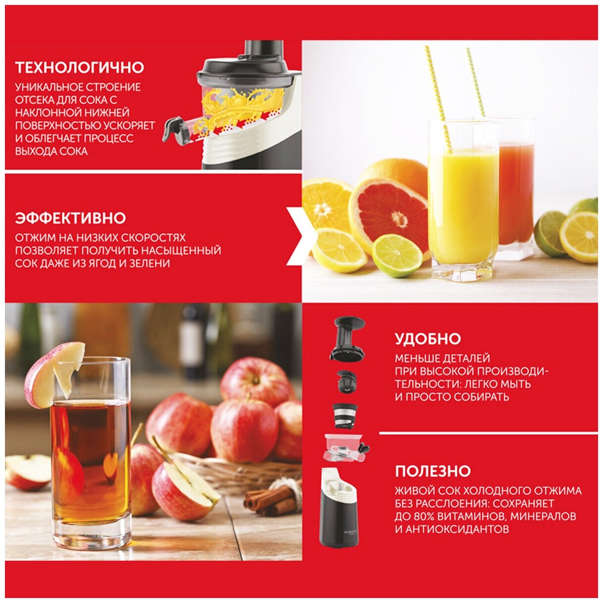 Шнековая соковыжималка — свежевыжатый сок холодного отжима быстро и легко, сохраняя антиоксиданты и витамины. Новая технология уникального строения отсека для сока с наклонной нижней поверхностью ускорит и облегчит выход сока. Емкость для сбора мякоти 600 мл и емкость для сбора сока 400 мл в комплекте. Безопасность эксплуатации обеспечивает функция «автоматическая блокировка при неправильной сборке».