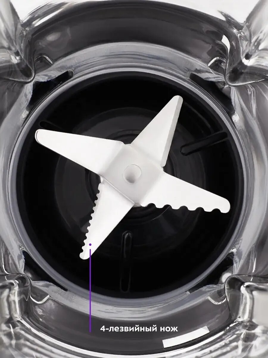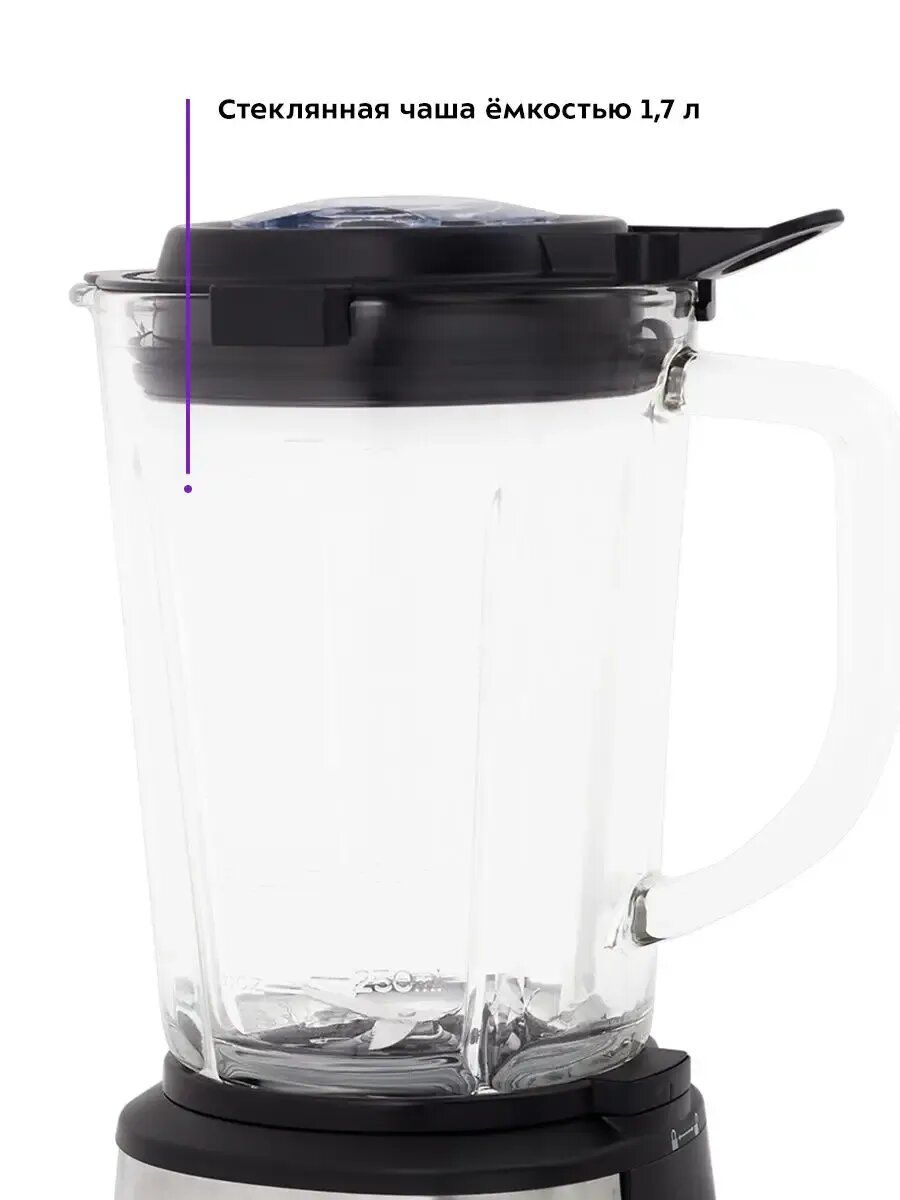 Для измельчения продуктов прибор имеет четырехлезвийный нож из нержавеющей стали. Чаша блендера 1,5 литра изготовлена из толстого стекла. В крышке имеется отверстие для добавления ингредиентов в процессе работы. Надежное и устойчивое положение на кухонной поверхности обеспечивают противоскользящие ножки.