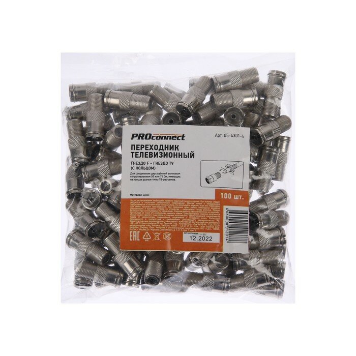 Переход штекер F - гнездо TV PROconnect предназначен для соединения двух ТВ-кабелей волновым сопротивлением 50 или 75 Ом с разными разъемами при подключении эфирного, спутникового и кабельного телевидения. С одной стороны располагается штекер F-разъема, а с другой - гнездо ТВ-разъема. Изготовлен переход из никелированного сплава первичной меди (биметалл), что гарантирует минимальный уровень потерь при прохождении сигнала. Переход в процессе монтажа не требует применения каких-либо специальных инструментов. Такой высокочастотный соединитель имеет ряд положительных преимуществ:- имеет высокую стойкость соединения разъем-кабель к внешним механическим воздействиям;