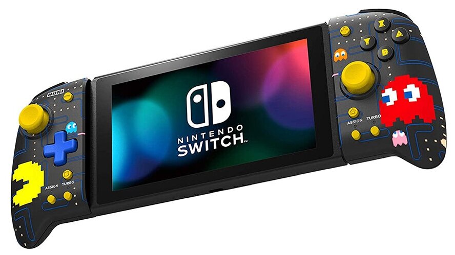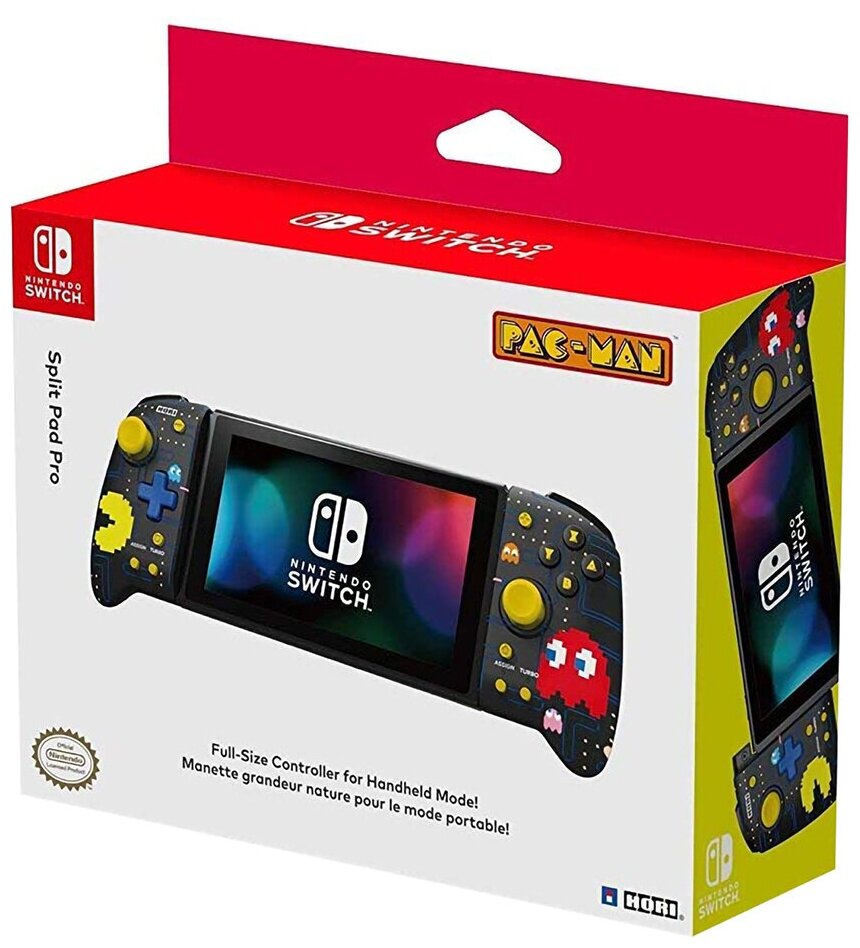 Hori Nintendo Switch Split Pad Pro (Pac-Man) — это геймпад для платформы Nintendo Switch с джойстиками стандартных размеров, точным D-Pad (кнопкой-крестовиной), а также крупными передними кнопками. В устройстве используются программируемые триггеры, функция Turbo и прочее. Геймпад прекрасно подходит для экшенов, и не только. С этим геймпадом вы сможете побеждать еще чаще!Если вам нужно придумать какой-то необычный и дельный подарок для друга-геймера, у которого есть Nintendo Switch, то обратите внимание на этот геймпад. Хороший нетривиальный выбор, который несомненно не оставит его равнодушным. Важно: устройство поддерживает только ручной режим и не оснащено датчиками движения, ИК-камерой, HD Rumble или NFC. Если у вас появятся сложности с подключением геймпада, то обязательно убедитесь в том, что контроллеры Joy-Con полностью отключены.Главные особенности:- Контроллер стандартных размеров- Оснащен широким захватом, удобными кнопками, триггерами, джойстиками и D-Pad (кнопка-крестовина).- Оборудован программируемыми триггерами, имеет функцию Turbo и пр.- Дизайн выполнен в стиле Pac-Man.- Имеет официальную лицензию от Nintendo и Bandai Namco Entertainment.