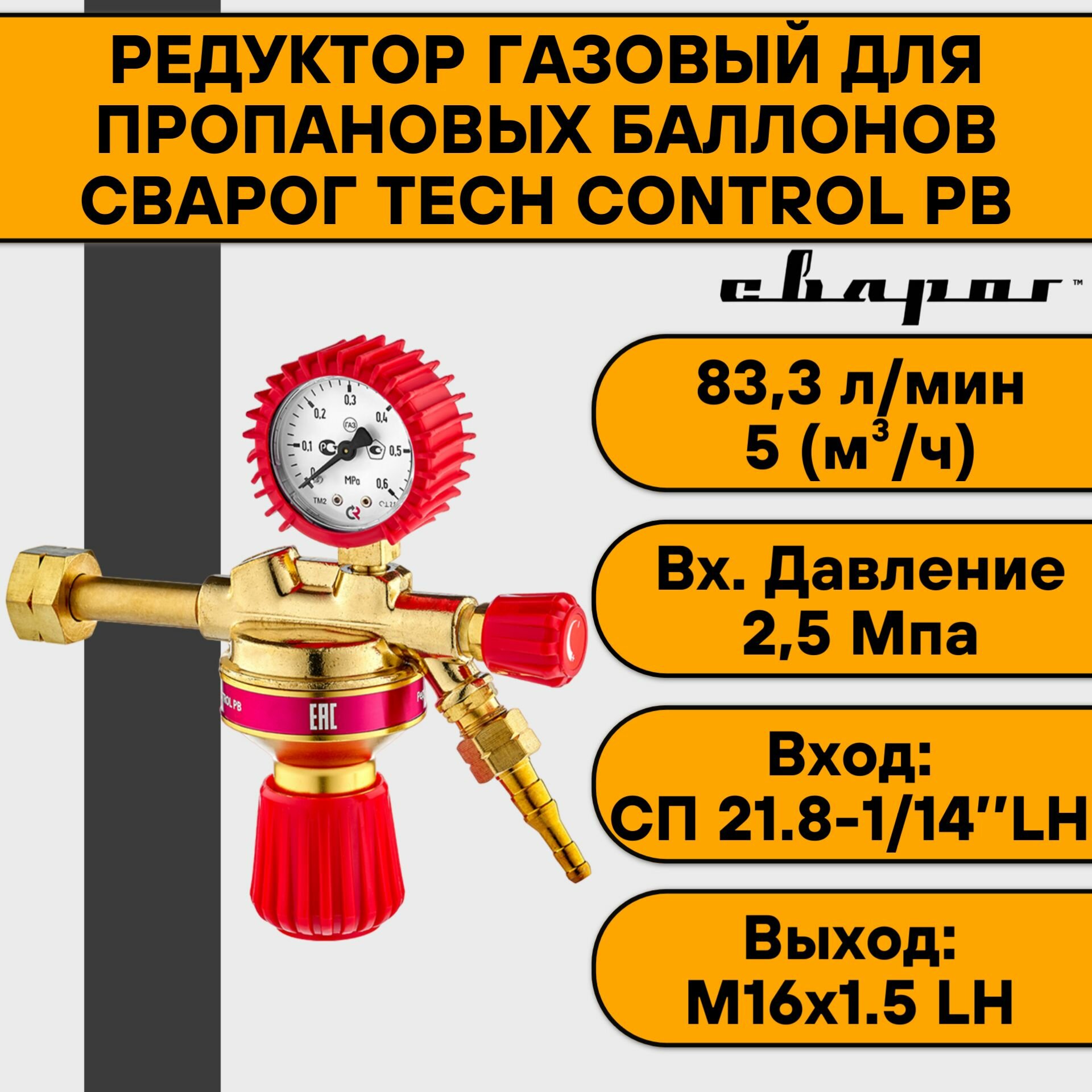 Редуктор пропановый ТECH CONTROL PB LR-128 Сварог предназначен для понижения и регулирования давления газа, поступающего из баллона, и автоматического поддержания постоянно заданного рабочего давления газа. На редукторе установлено показывающее устройства: для определения давления в рабочей камере – на 0.6 МПа. Оснастка присоединяется к баллону входным штуцером с помощью гайки с резьбой СП21.8 – 14 ниток на 1 дюйм LH. Отбор газа осуществляется через ниппель универсальный, к которому присоединяется рукав с внутренним диаметром 9 мм или 6.3 мм по ГОСТ 9356-75.