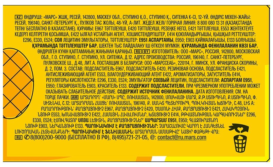 | Состав | Подсластитель Е967, подсластитель Е420, резиновая основа, подсластитель Е421, антислеживающий агент Е553, влагоудерживающий агент Е422, ароматизаторы, загуститель Е414, регуляторы кислотности: Е296, Е330, Е524; эмульгатор соевый лецитин, подсластители: аспартам Е951, Е950; глазирователь Е903, краситель Е133. |