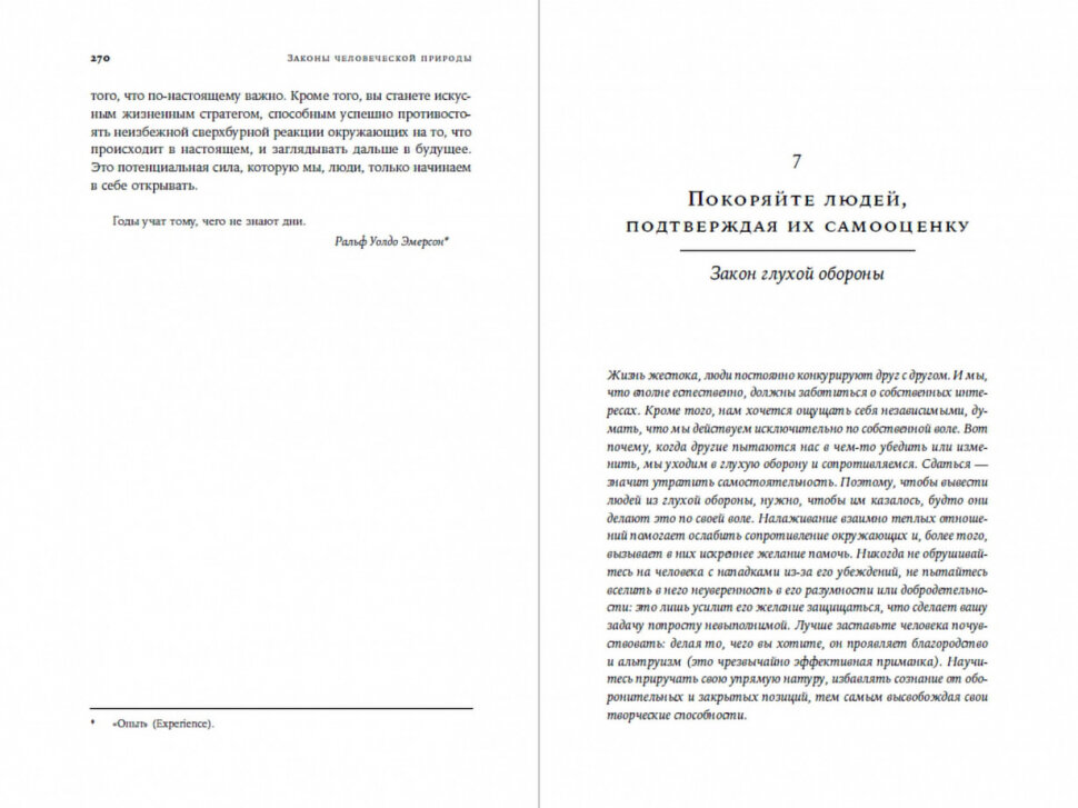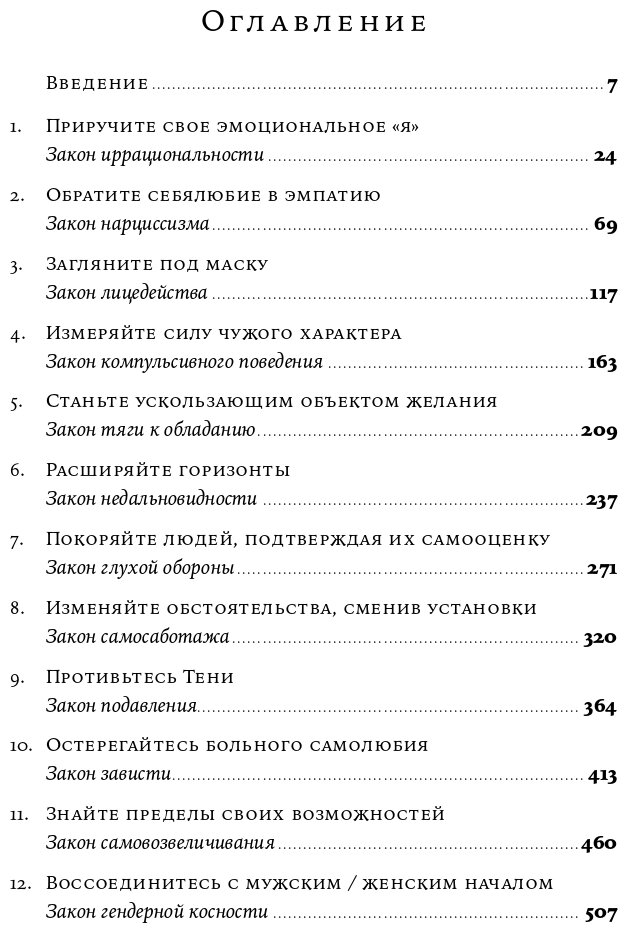 Роберт Грин подкрепляет теорию примерами из мировой истории — вы поймете, как актёры используют закон тяги к обладанию, или научитесь использовать теневую сторону своей личности во благо, как это сделал Стив Джобс. «Законы человеческой природы» — попытка максимально полно объяснить нас самих, книга, которая может гидом в любой жизненной ситуации.