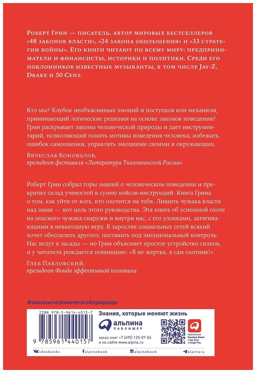 Роберт Грин — публицист, автор бестселлера «48 законов власти». Анализируя исследования психотерапевтов, биографии исторических личностей и собственные наблюдения, он выводит 18 универсальных законов, которые определяют поведение людей. За основу взяты работы Карла Густава Юнга, Пола Экмана, Артура Шопенгауэра, Джозефа Леду, Франса де Вааля и других ученых и знаменитых мыслителей. В каждой главе описываются силы, которые управляют человеческой природой: например нарциссизм, зависть, агрессия, непостоянство. По мнению Грина, в большинстве своем люди даже не осознают глубинное действие этих сил, которые буквально тянут нас в разные стороны. Но если мы поймем, откуда они взялись и как действуют, то сможем отследить и деструктивные паттерны поведения — своего или чужого. Тогда мы поймем, как можно от них избавиться, и сможем обратить эти законы в свою пользу.