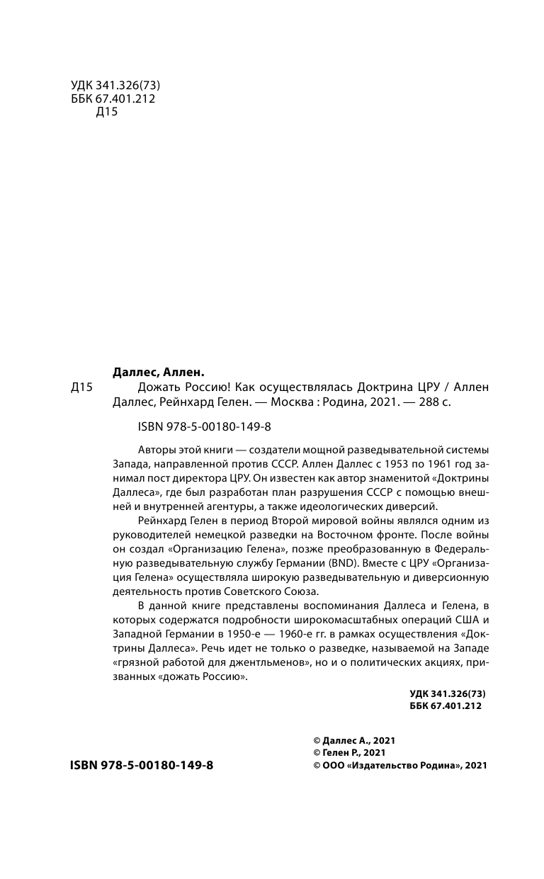 Дожать Россию! Как осуществлялась Доктрина ЦРУ (Аллен Даллес); Родина Издательство ООО, 2021