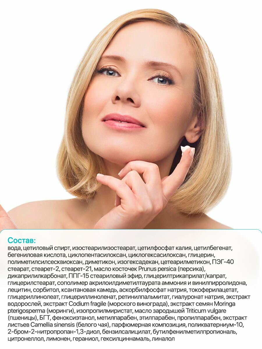 | Состав | вода, цетиловый спирт, изостеарилизостеарат, цетилфосфат калия, цетилбегенат, бегениловая кислота, циклопентасилоксан, циклогексасилоксан, глицерин, полиметилсилсесквиоксан, диметикон, изогексадекан, цетеарилметикон, пэг-40 стеарат, стеарет-2, стеарет-21, масло косточек prunus persica (персика), дикаприлилкарбонат, ппг-15 стеариловый эфир, глицерилтрикаприлат/капрат, глицерилстеарат, сополимер акрилоилдиметилтаурата аммония и винилпирролидона, лецитин, сорбитол, ксантановая камедь, аскорбилфосфат натрия, токоферилацетат, глицериллинолеат, глицериллиноленат, ретинилпальмитат, гиалуронат натрия, экстракт водорослей, экстракт codium fragile (морского винограда), экстракт семян moringa pterigosperma (моринги), изопропилмиристат, масло зародышей triticum vulgare (пшеницы), бгт, феноксиэтанол, метилпарабен, этилпарабен, пропилпарабен, экстракт листьев camellia sinensis (белого чая), парфюмерная композиция, поликватерниум-10, 2-бром-2-нитропропан-1,3-диол, бензилсалицилат, бутилфенилметилпропиональ, цитронеллол, лимонен, гераниол, гексилциннамаль, линалол |