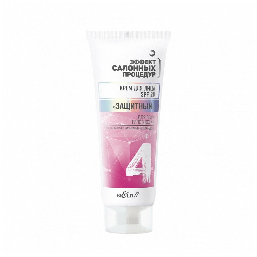 Крем для лица SPF20 "Защитный" для всех типов кожи - завершающий этап проведения пилинга и других очищающих косметических процедур. Активные компоненты оказывают восстанавливающее действие, питают, поддерживают оптимальный водный баланс в клетках кожи. Входящие в состав крема UV-фильтры защищают от воздействия UVA и UVB-лучей, создавая щит для вашей кожи, предотвращая появление пигментных пятен и веснушек. Д-пантенол смягчает, успокаивает и увлажняет кожу, устраняя ощущения сухости и стянутости. ОБЯЗАТЕЛЬНО используйте крем SPF 20 "Защитный" косметической линии "Эффект салонных процедур" после пилингов и других косметических процедур.