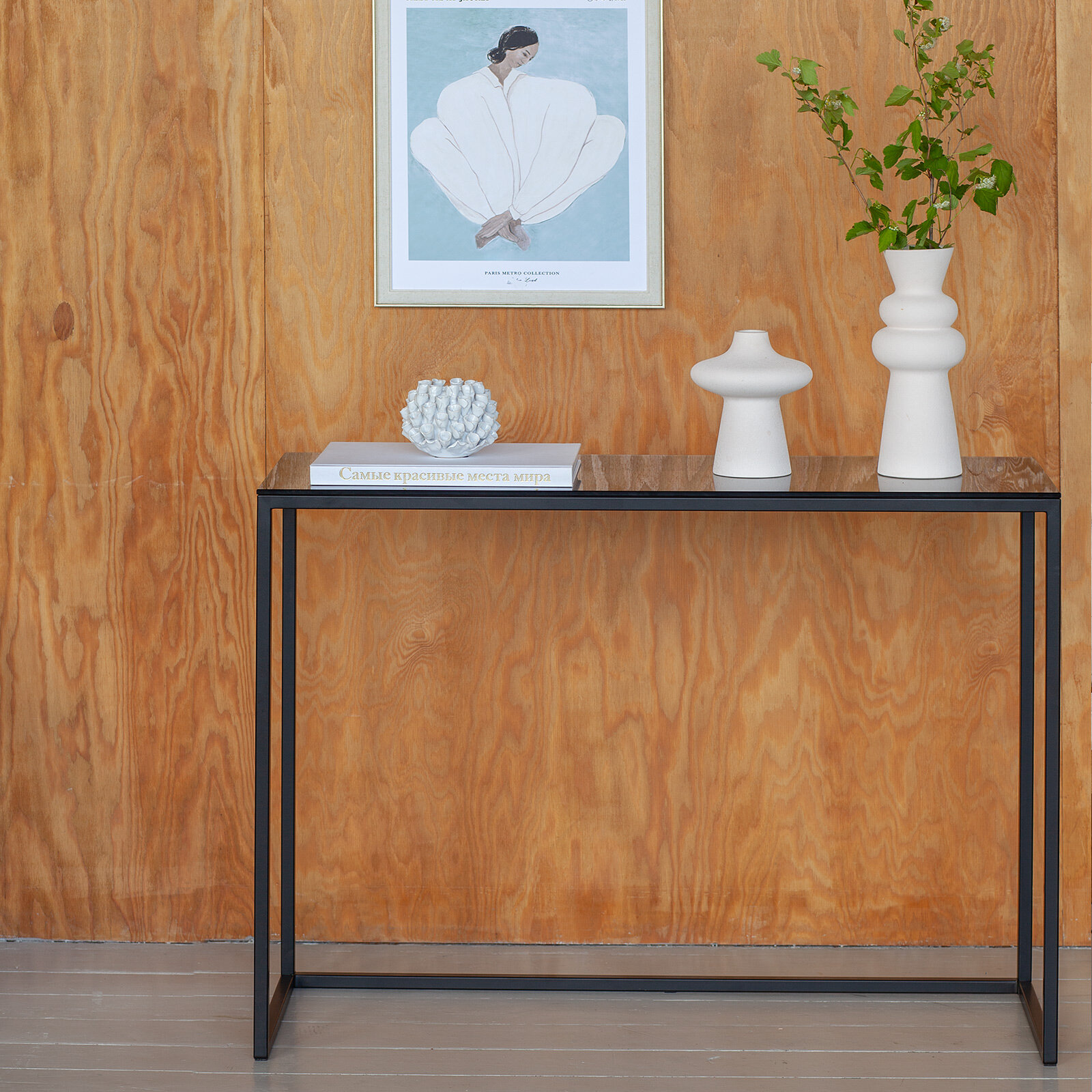 Каркас консольного стола изготовлен из стали, окрашенной порошковой краской черного цвета. Благодаря конструкции без лишних соединений стол обладает устойчивостью и долговечностью.