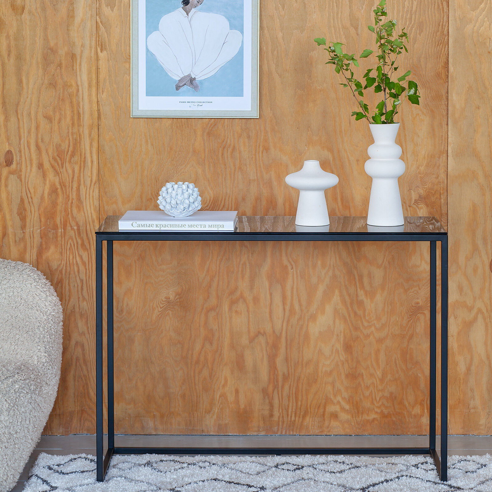 "Стол консоль со столешницей из каленого тонированного стекла выгодно сочетает в себе удобство и комфорт. Его возможно использовать как туалетный столик или рабочее место. Благодаря стильному дизайну отлично подойдет для минималистичного или лофт интерьера. Толщина стеклянной столешницы 8 мм.
