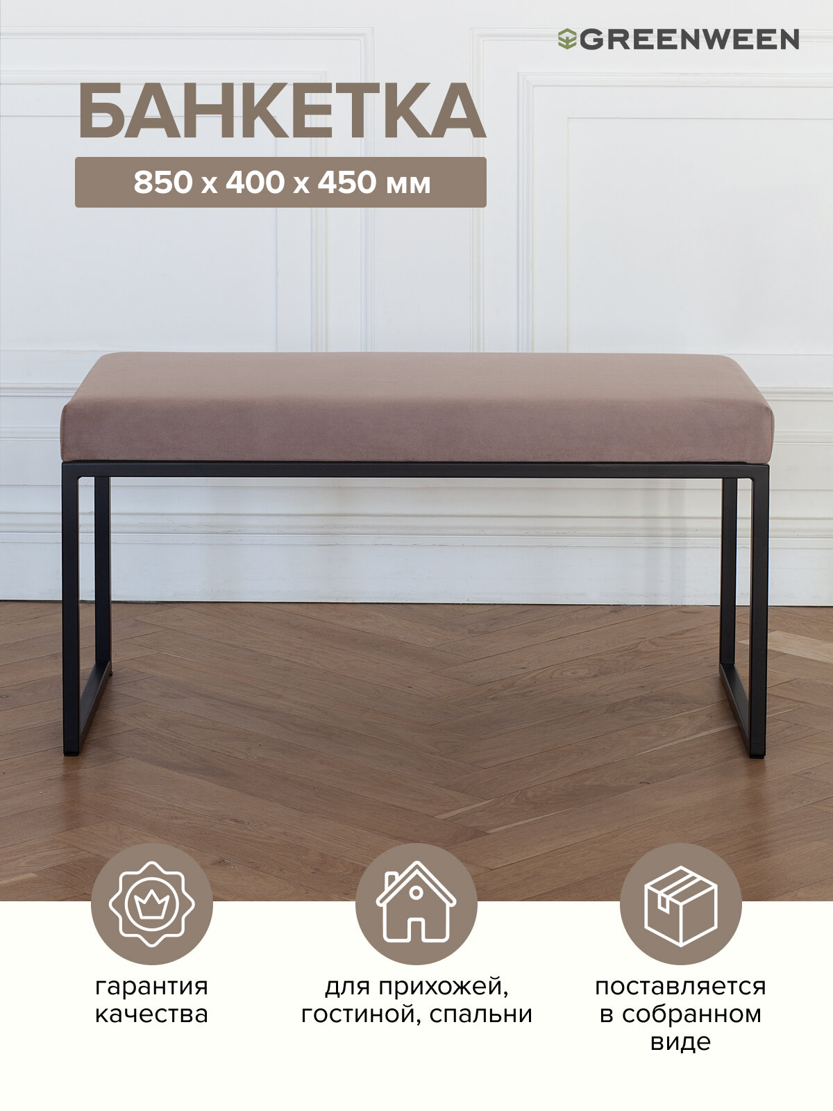 "Компактная банкетка от GreenWeen впишется в интерьер любого помещения: от спальни до гардеробной. В прихожей позволит удобно расположиться в ожидании, в гардеробной - разложить вещи, в спальне её можно использовать даже как место для чтения.