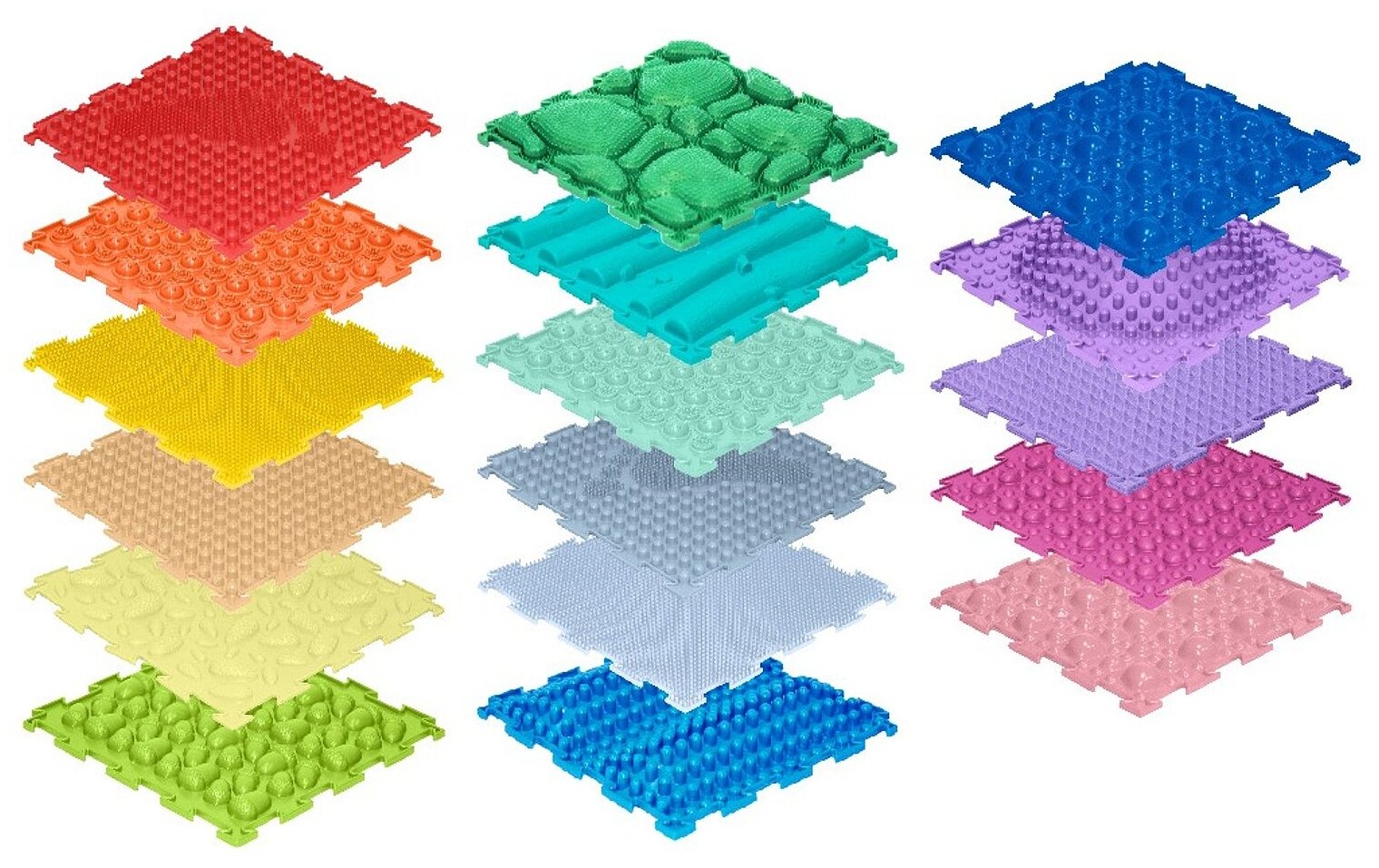 видов поверхностей. Сочетание разнопрофильных и разножёстких модулей позволяет проводить занятия максимально эффективно. Богатая цветовая палитра ковриков наверняка понравится вашему ребёнку.