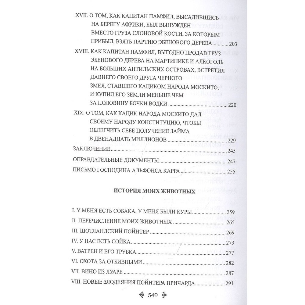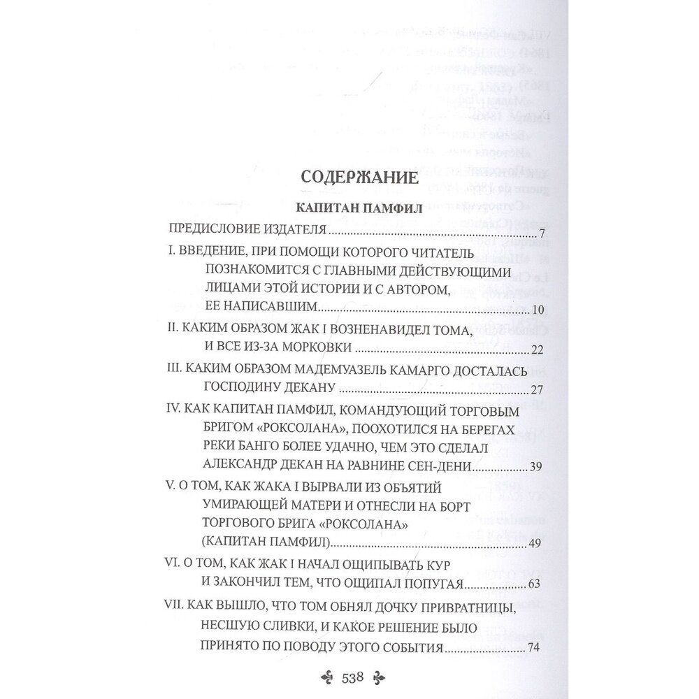 В очередной томик иллюстрированного собрания сочинений Дюма включены две, редко издаваемые, великолепно рассказанные, увлекательные истории о невероятных приключениях капитана Памфила в Африке и Америке и шутливая повесть о животных, живших у знакомых Дюма. В этих повестях есть и приключения и романтика,взятие торгового судна, погашение капитаном бунта на бриге "Роксолана", сражения с дикими животными в джунглях и описание потрясающих пейзажей.