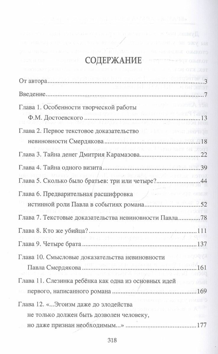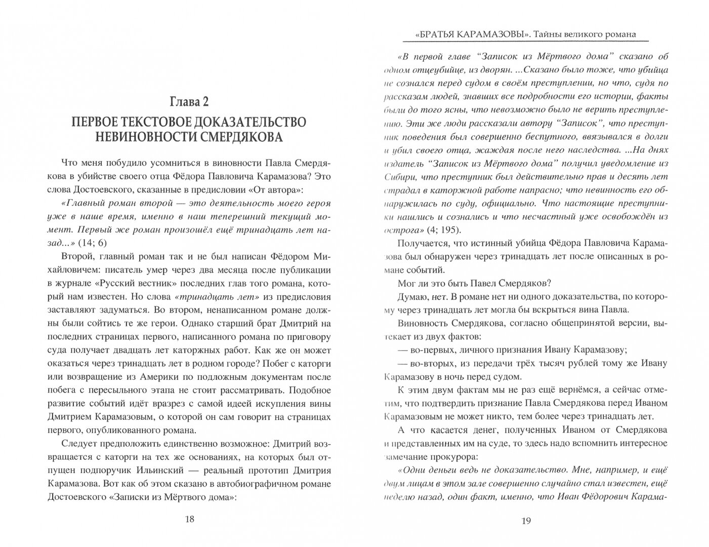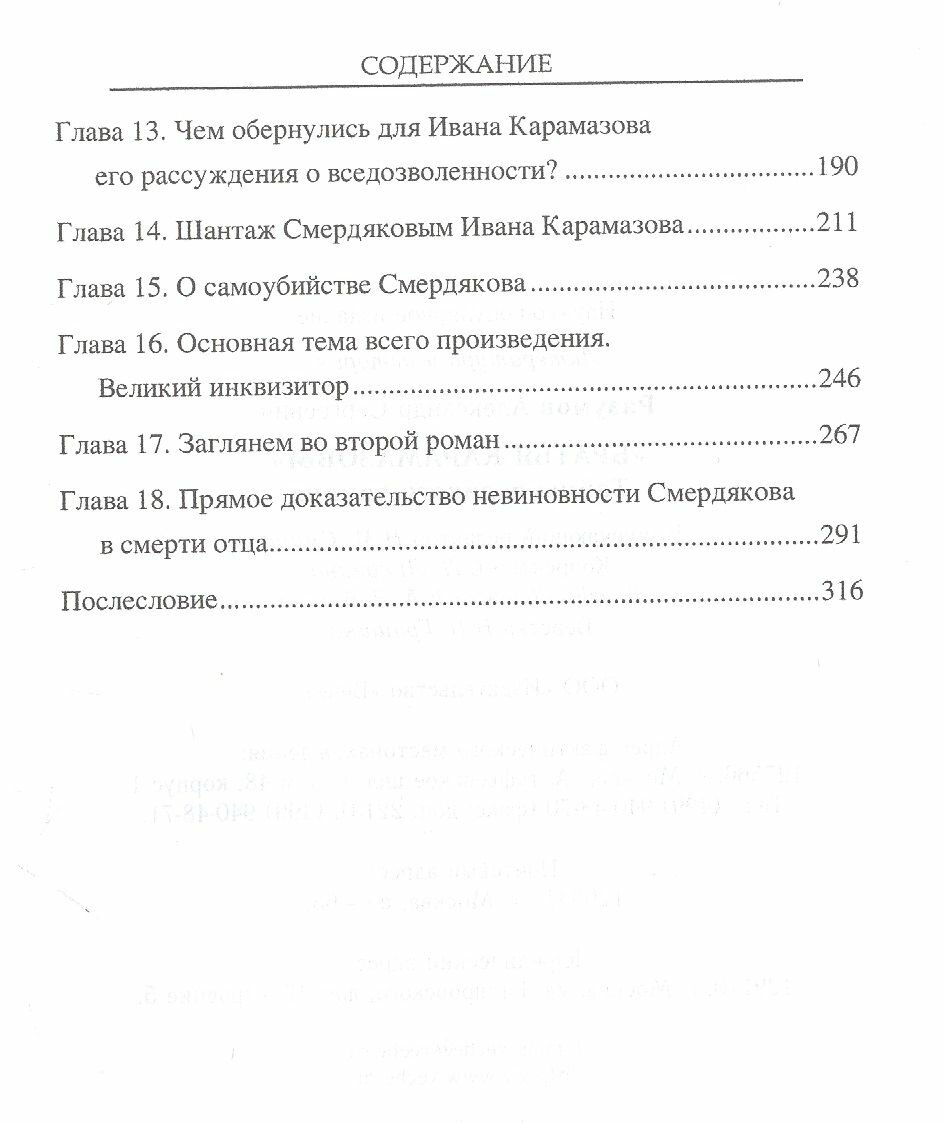 событий этого произведения с детективным сюжетом, из которого нам известна только половина, свидетельствует: Павел Смердяков преступления не совершал и всмерти своего отца не виновен. Но тогда вслед за вполне закономерным вопросом: «Кто же убил старика Карамазова?» – возникает тот главный вопрос, ответ на который открывает религиозно-философскую идею, заложенную великим русским писателем в самое главное для него произведение: «Что заставило невиновного Павла Смердякова пойти на самоубийство и тем загубить свою бессмертную душу?» Есть только одна возможность найти ответ на этот непростой вопрос – взглянуть на описанные в романе события глазами Павла и понять, кто подтолкнул его на великий грех. Об этом и многом другом рассказывает наша книга.