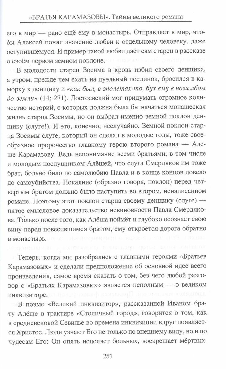 Книга с очень интересными обоснованными выводами, большинство из которых я, как большой поклонник творчества Ф.М. Достоевского, безоговорочно поддерживаю. Впечатление портит огромное количество повторений, в том числе одних и тех же выдержек из анализируемого произведения. Например, на одной странице может быть несколько раз приведена одинаковая цитата, используемая автором также и в дальнейшем. Данный приём не усиливает довод, но увеличивает досаду, что такой труд выглядит скучным. В любом случае, на мой взгляд, книга обязательна к прочтению для тех, кто хочет разобраться в великом произведении и увидеть отличный от большинства взгляд на роман «Братья Карамазовы».