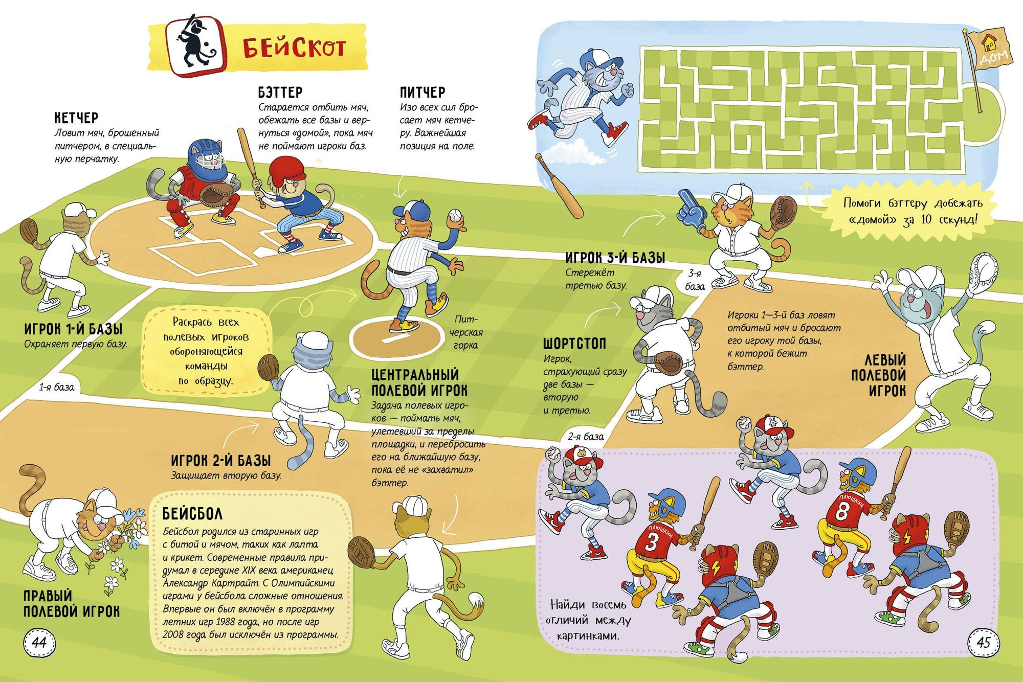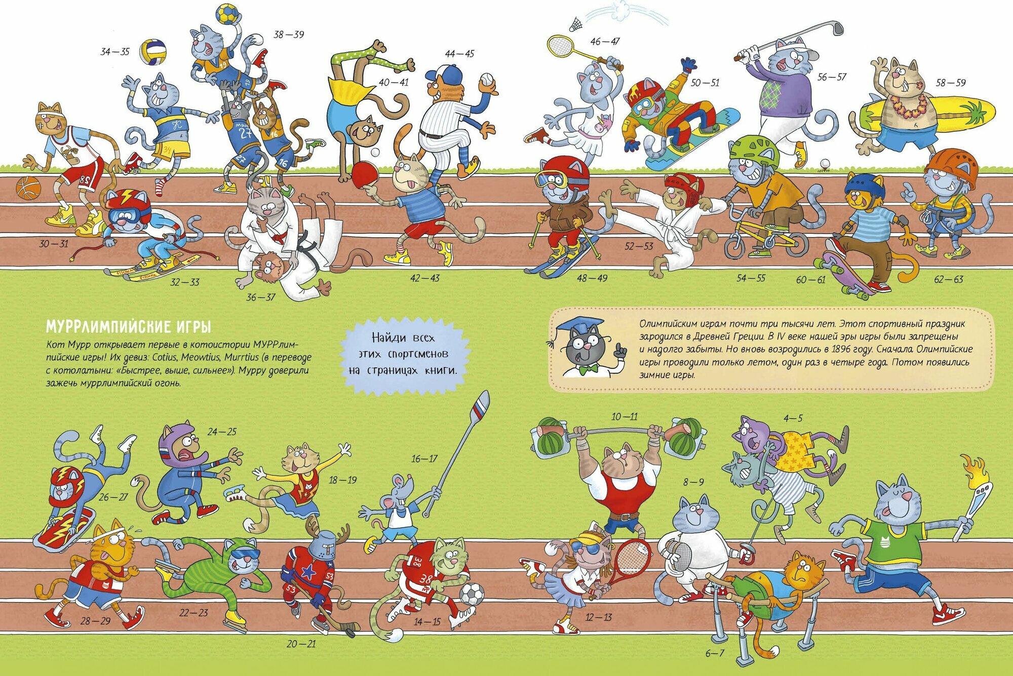 Книга большая и яркая. 30 видов спорта, и зимние и летние. Про каждый спорт краткая историческая справка, и коротко правила игры, соревнований. Забавные коты со своими приколами, позитивный настрой, незамысловатые задания на каждой странице. Много лабиринтов, которые часто невозможно пройти из-за того, что страницы книги склеены, это расстраивает. Книга-игра должна быть удобной.