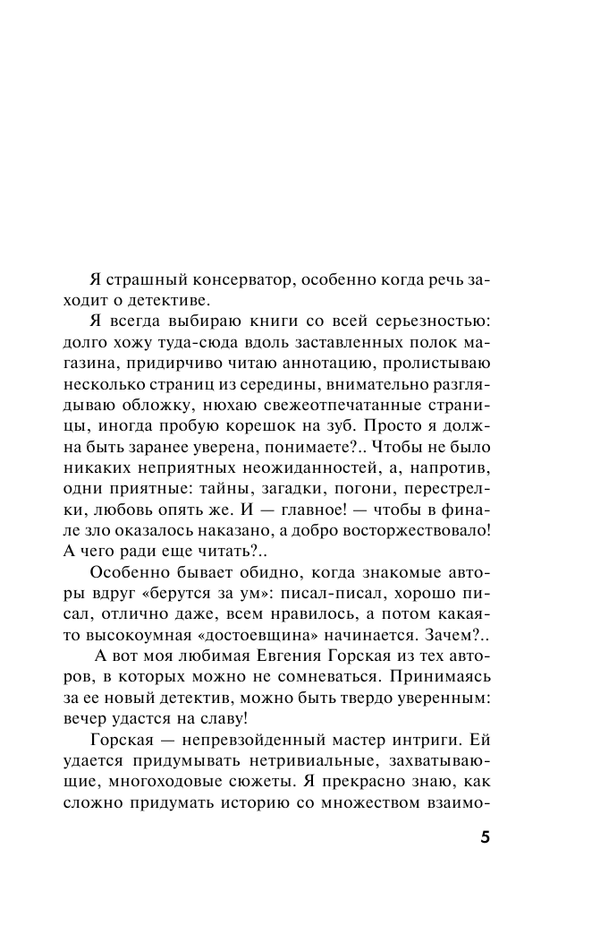 Я с удовольствием читаю детективы Евгении Горской, очень интересно и занимательно пишет автор. Ведь не зря практически каждая книга имеет предисловие, написанное Татьяной Устиновой. Рекомендую к прочтению! -