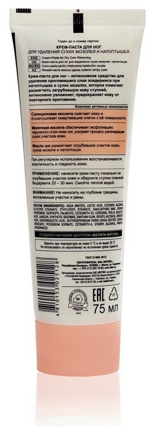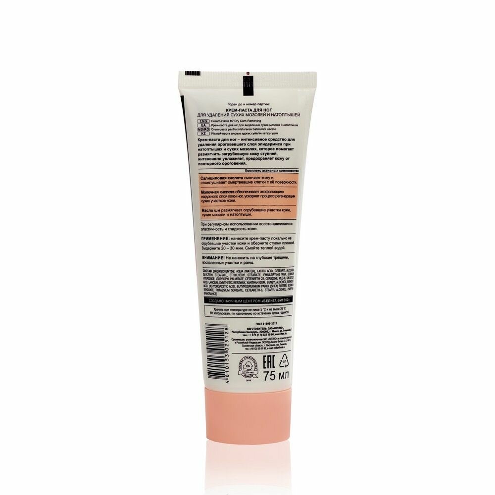 Размягчает огрубевшие участки кожи, сухие мозоли и натоптыши, восстанавливает эластичность и гладкость кожи. Интенсивное средство для удаления ороговевшего слоя эпидермиса при натоптышах и сухих мозолях, которое помогает размягчить загрубевшую кожу ступней, интенсивно увлажняет, предохраняет кожу от повторного ороговения. Салициловая кислота смягчает кожу и отшелушивает омертвевшие клетки с её поверхности. Гликолевая кислота обеспечивает эксфолиацию наружного слоя кожи ног, ускоряет процесс регенерации сухих участков кожи.