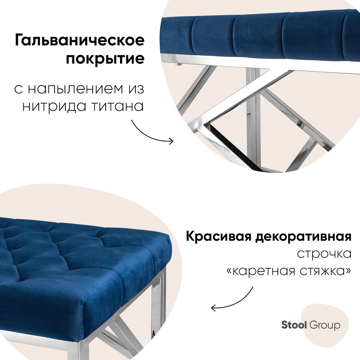 Банкетка выполнена из нержавеющей стали, что делает конструкцию прочной и надежной. Обивка сиденья - велюр. Материал обладает особой прочностью и износоустойчивостью, приятный на ощупь, эластичный и теплый.