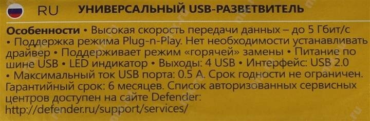 Defender Quadro Power USB 4-ports 83504 не требует драйвера, поддерживает режим «горячей» замены. Так же имеет токовую защиту портов USB. Высокая скорость передачи данных - до 480 Мбит/с. Имеет индикатор подключения.