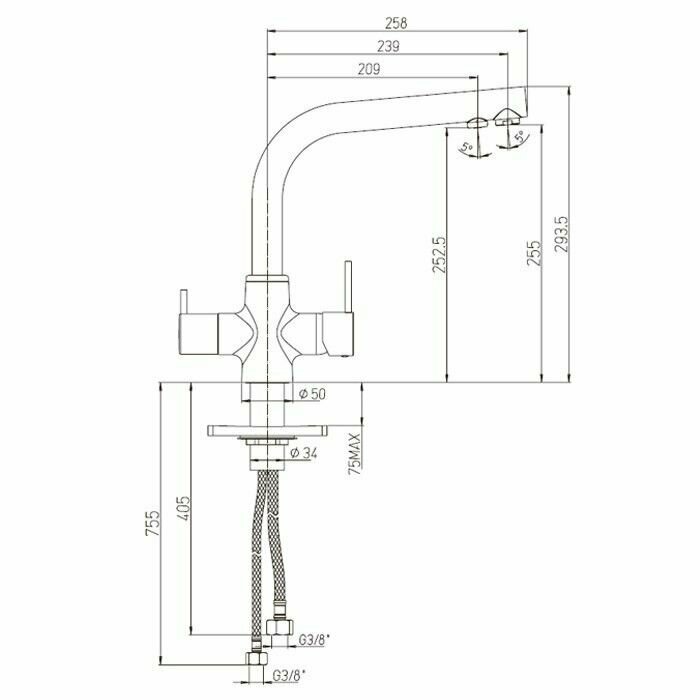Смеситель для кухни Paini Arena 92CR6433VEB90DAKM. В смесителе есть отдельный вывод подачи питьевой воды, поэтому вам не придется предусматривать лишние отверстия на мойке для соединения фильтра и отдельного крана для очищенной воды.