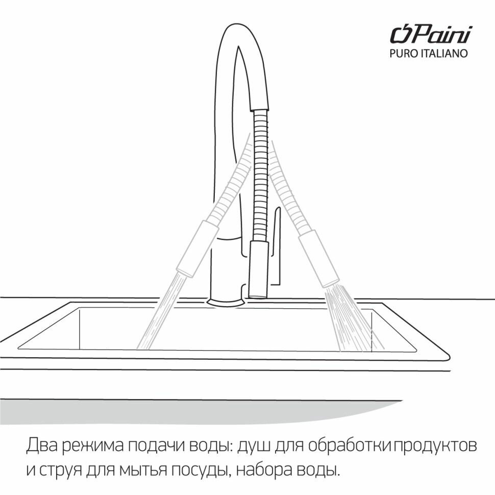 Смеситель для кухни Paini . Материал: латунь. Излив: выдвижной поворотный. Управление: однорычажное. Тип подводки: гибкая 3/8. Монтаж: на мойку. Керамический картридж Nuovo Galatron обеспечит простую регулировку напора и температуры воды и гарантирует долговечное использование. Аэратор Neoperl насыщает поток кислородом, увеличивает напор, что существенно экономит воду. Сеточка легко очищается пальцем.