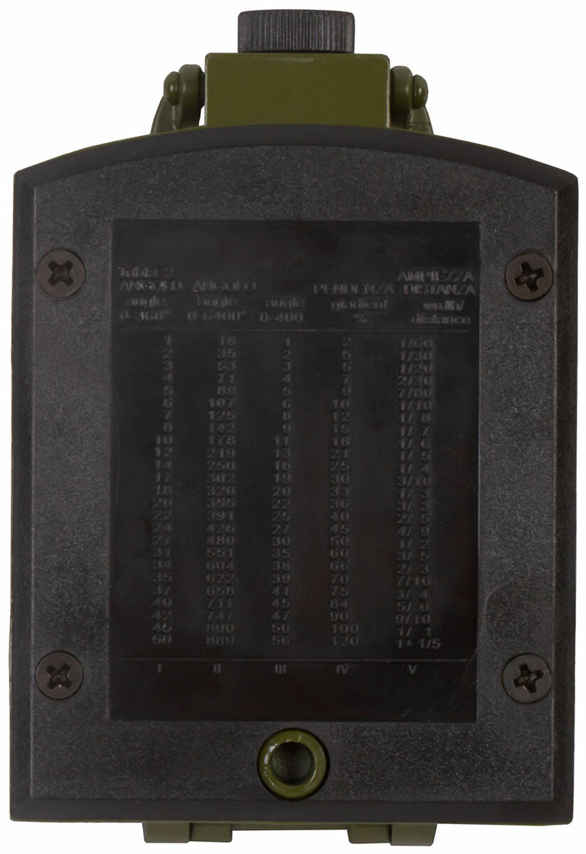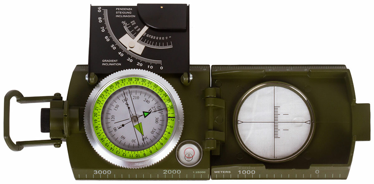 В Levenhuk Army AC20 также есть клинометр с полулимбом. Это небольшое устройство используется для измерения углов наклона и падения. Кроме того, присутствует пузырьковый уровень, который помогает выравнивать положение компаса относительно горизонтали. На задней крышке расположена таблица с формулами.