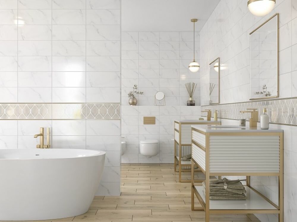 Завораживающая красота мрамора делает роскошным и элегантным любой интерьер. Глянцевая белая плитка с детально прорисованными прожилками отражает свет, создает ощущение чистоты, свежести и простора.