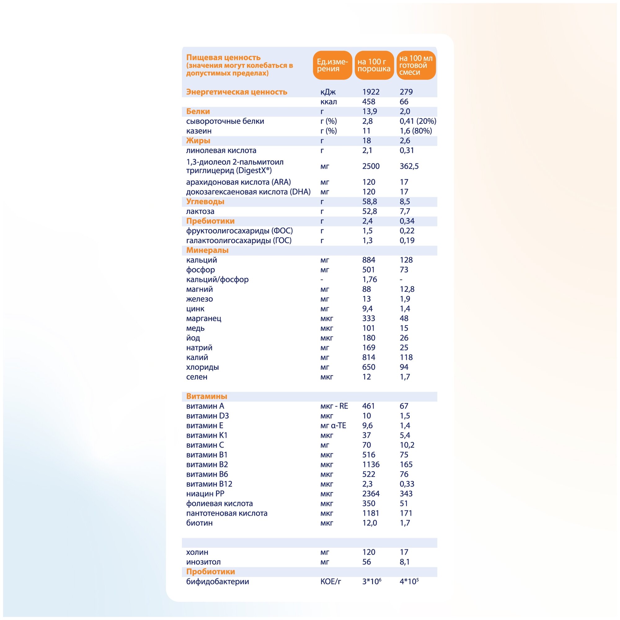 | Состав | Лактоза, обезжиренное сухое козье молоко, цельное сухое козье молоко, растительные масла (кокосовое, низкоэруковое рапсовое, подсолнечное), комплекс жиров DigestX® (1,3-диолеол 2-пальмитоил триглицерид), галактоолигосахариды, минеральный премикс (кальция цитрат, кальциевая соль ортофосфорной кислоты, карбонат кальция, карбонат магния, железа сульфат, натрия цитрат, калия гидроксид, цинка сульфат, кальция фосфат, кальция хлорид, магния хлорид, магния сульфат, меди сульфат, йодид калия, селенат натрия), фруктоолигосахариды, рыбий жир (источник DHA), арахидоновая кислота, холина битартрат, витаминный премикс (L-аскорбат натрия, L-аскорбиновая кислота, DL-альфа-токоферола ацетат, ниацинамид (синоним – никотинамид), тиамина гидрохлорид, рибофлавин, пиридоксина гидрохлорид, ретинол ацетат, фолиевая кислота, D-пантотенат кальция, фитоменадион, холекальциферол, D-биотин, циаонокобаламин), инозитол, бифидобактерии (BifidobacteriumAnimalis). Не содержит кристаллический сахар. |
