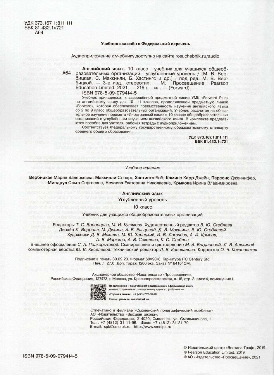 Учебное пособие принадлежит к завершённой предметной линии УМК «Forward Plus» по английскому языку для 10–11 классов, продолжающей предметную линию «Forward», которая обеспечивает преемственность изучения английского языка со 2 по 9 класс общеобразовательных организаций. Учебное пособие рассчитано на обязательное изучение предмета «Иностранный язык» в 10 классе общеобразовательных организаций с углублённым изучением английского языка. Соответствует Федеральному государственному образовательному стандарту среднего общего образования.