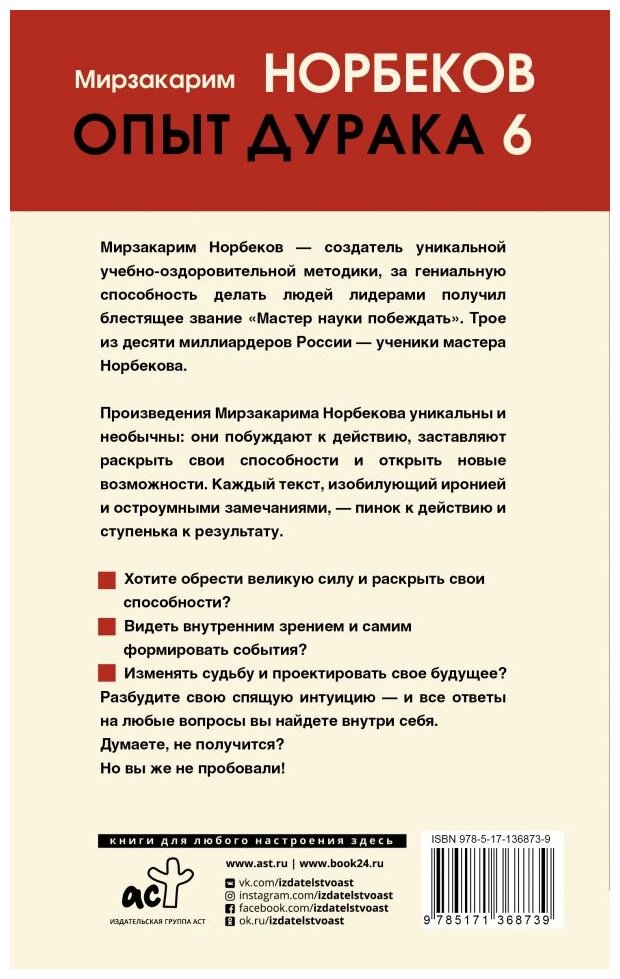 На сегодняшний день товар «Книга: Опыт дурака 6. Как работает интуиция (Норбеков Мирзакарим Санакулович); ИЗДАТЕЛЬСТВО "АСТ", 2021» можно купить с кешбеком в 1 магазине: Читай-город