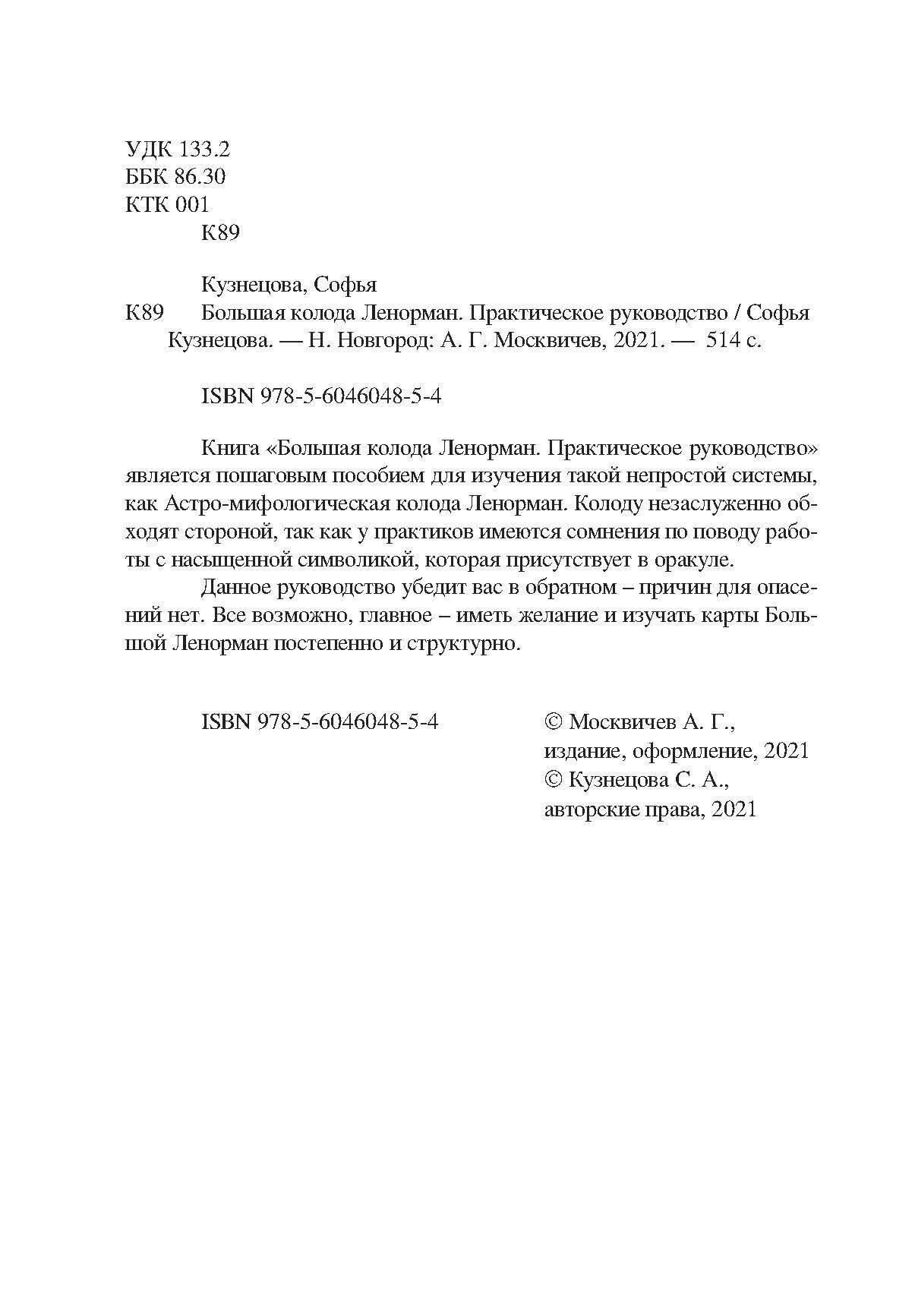 Очень подробное и полное руководство по большой Ленорман. С малой-то всё было понятно, а большая - та ещё загадка, не очень популярная ввиду сложности, поди поищи что-то дельное. Я решила взять руководство от любимого издательства как только увидела его в продаже и не жалею. И сама книга очень хороша и насыщена информацией по картам одно деление их на группы чего стоит, кстати, и ее оформление прекрасно - твердая хорошая обложка, качественная белая бумага, прочный корешок. Очень довольна, придраться не к чему и не хочется. Качество доставки так же без замечаний - упаковали надежно, от души. :