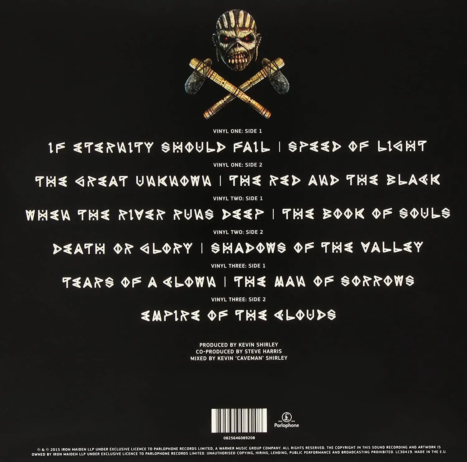 Тройная пластинка. По две песни на стороне. Сторона F целиком занята величественной Empire Of The Clouds авторства Брюса Дикинсона. Великолепный материал! Самый длинный студийный альбом Iron Maiden