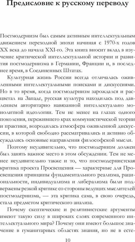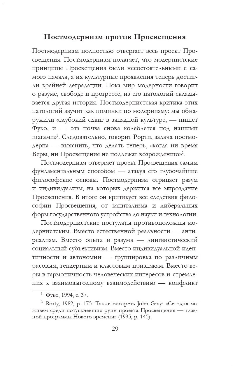 Книга представляет собой очень подробный анализ происхождения, развития и угасания постмодернизма. Исследование чем-то напоминает учебник по истории модернизма (начиная с эпохи Просвещения) и постмодернизма (которое именуется здесь итоговой стадией Контрпросвещения). Чувствуется фобический страх автора перед левыми политическими течениями. Отчего-то именно левых социалистов он именует основными прародителями постмодернизма, с чем просто невозможно согласиться. Но в остальном книга очень интересная и полезная для тех, кто хочет познакомиться с разными точками зрения на это важнейшее явление культуры, философии, литературы и политики ХХ века.