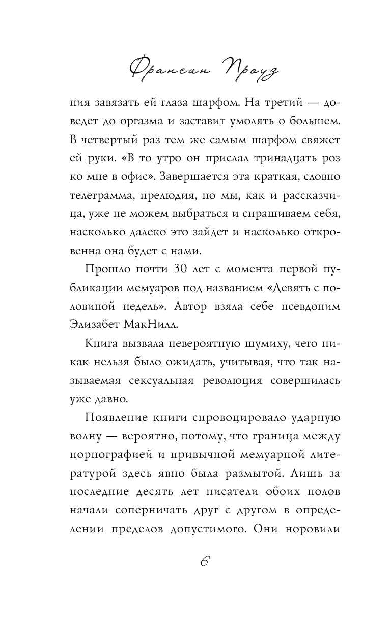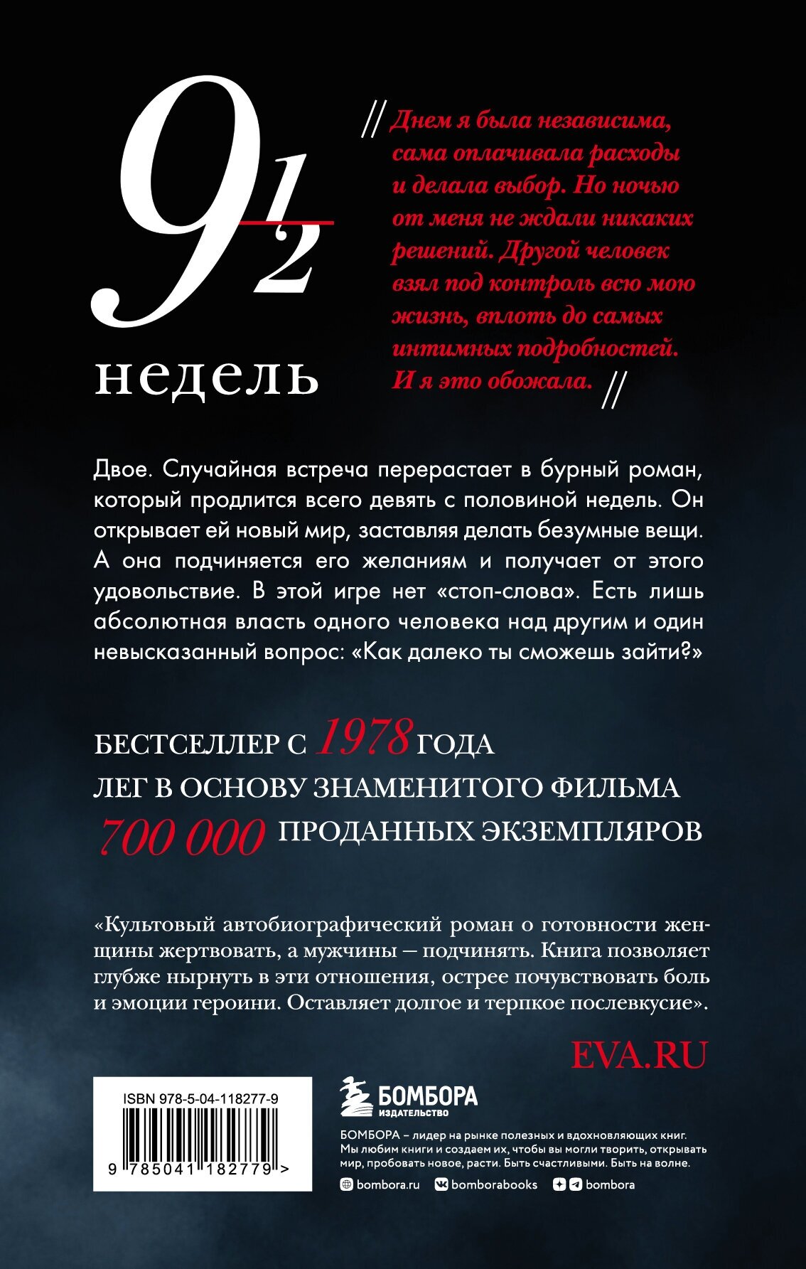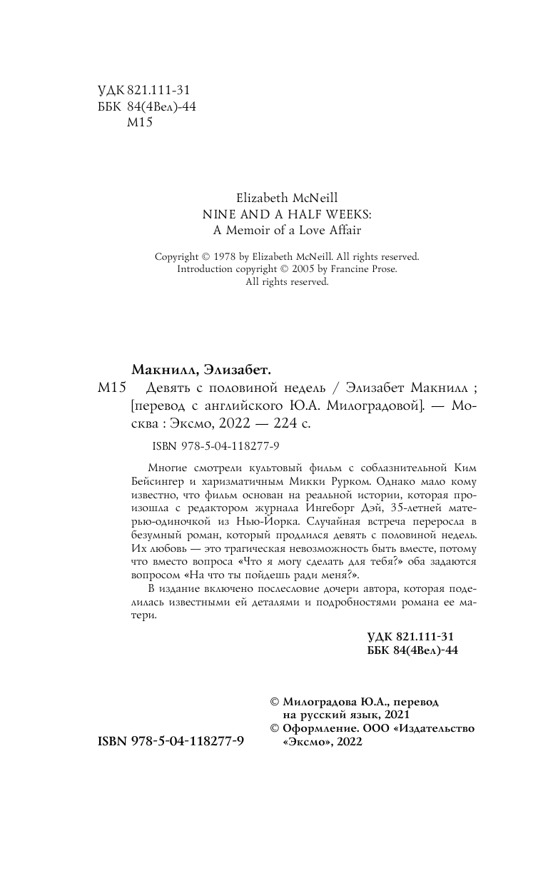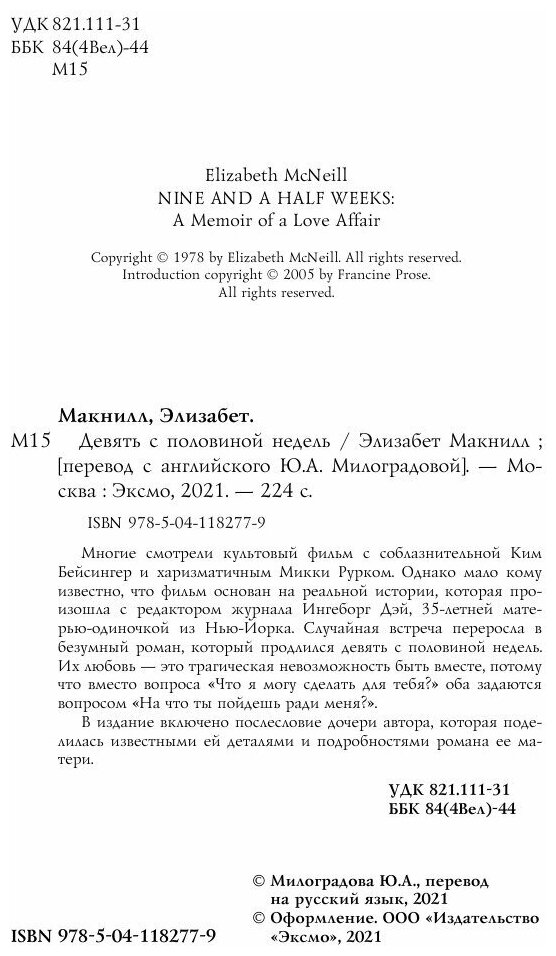 Многие смотрели культовый фильм с соблазнительной Ким Бейсингер и харизматичным Микки Рурком. Однако мало кому известно, что фильм основан на реальной истории, которая с произошла с редактором журнала Ингеборг Дэй, 35-летней матерью-одиночкой из Нью-Йорка. Случайная встреча переросла в безумный роман, который продлился девять с половиной недель. Их любовь - это трагическая невозможность быть вместе, потому что вместо вопроса "Что я могу сделать для тебя?", оба задаются вопросом "На что ты пойдешь ради меня?". В издание включено послесловие дочери автора, которая поделилась известными ей деталями и подробностями романа ее матери. "Днем я была независима, сама оплачивала расходы и делала выбор. Но ночью от меня не ждали никаких решений. Другой человек взял под контроль всю мою жизнь, вплоть до самых интимных подробностей. И я это обожала". Двое. Случайная встреча перерастает в бурный роман, который продлится всего девять с половиной недель. Он открывает ей новый мир, заставляя делать безумные вещи. А она подчиняется его желаниям и получает от этого удовольствие. В этой игре нет "стоп-слова". Есть лишь абсолютная власть одного человека над другим и один невысказанный вопрос: "Как далеко ты сможешь зайти?" Бестселлер с 1978 года. Лег в основу знаменитого фильма. 700 000 проданных экземпляров. "Культовый автобиографический роман о готовности женщины жертвовать, а мужчины - подчинять. Книга позволяет глубже нырнуть в эти отношения, острее почувствовать боль и эмоции героини. Оставляет долгое и терпкое послевкусие". - EVA dot RU