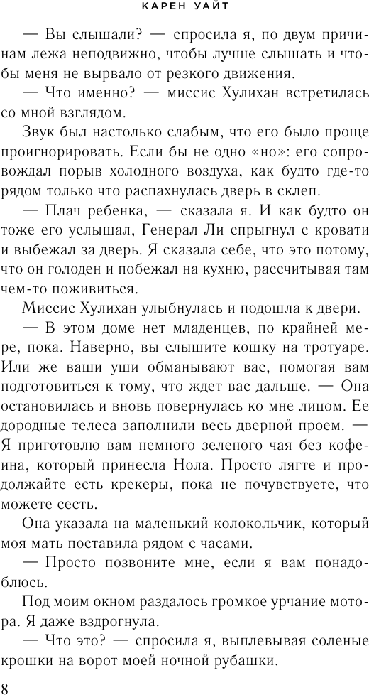 Пожалуй самая пресная книга Карен Уйат. Первые две части этой истории были динамичные, интригующие. Третья часть была средней. Четвёртая вовсе скучна. 3/4 книги занимают охи и ахи главной героини Мелли о Джеке (что напоминает переживания подростков, а никак не взрослой 40-летней женщины). И вновь утомительное описание одежды Софи (право слово, сложилось ощущение что автору платили за количество слов, иначе к чему миллионное описание безвкусной одежды). Призраки, загадка имели место быть. Но уделено им всего ничего. Моя оценка 3/10. Оформление книги на высоте. Содержание же почти на нуле. Уж, не знаю, что в последующих частях этой серии, но уже в 4 части сюжет высосан из пальца. Не было той интриги, когда хочется читать не останавливаясь.