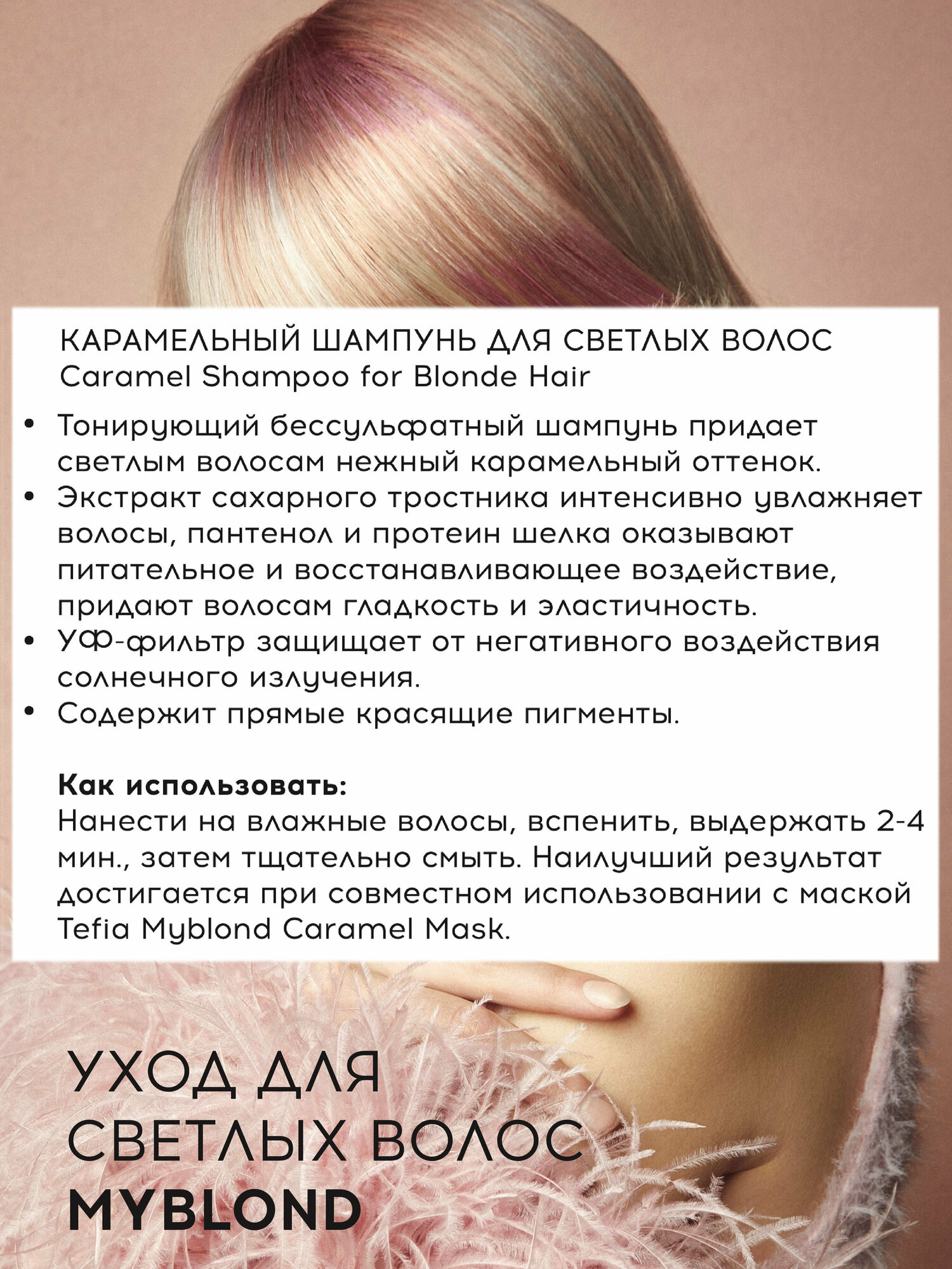 • Тонирующий бессульфатный шампунь придает светлым волосам нежный карамельный оттенок.