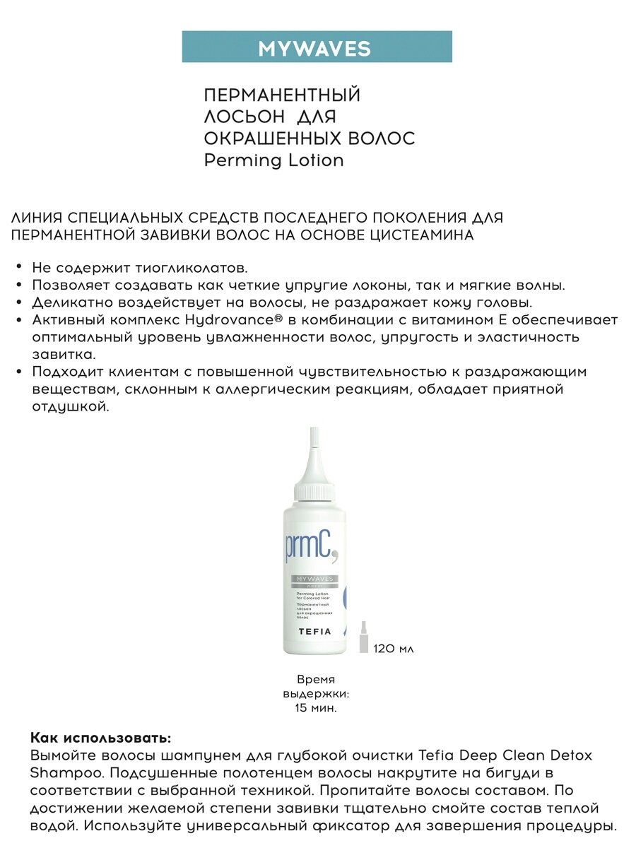 Способ применения: Вымойте волосы шампунем для глубокой очистки Tefia Deep Clean Detox Shampoo. Подсушенные полотенцем волосы накрутите на бигуди в соответствии с выбранной техникой. Тщательно пропитайте волосы составом. Время выдержки: до 15 минут. По достижении желаемой степени завивки смойте состав теплой водой. Используйте универсальный фиксатор для завершения процедуры.