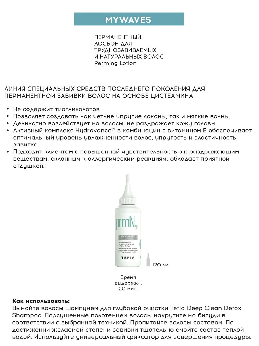 | Полное наименование | Перманентный лосьон для труднозавиваемых и натуральных волос 120мл |