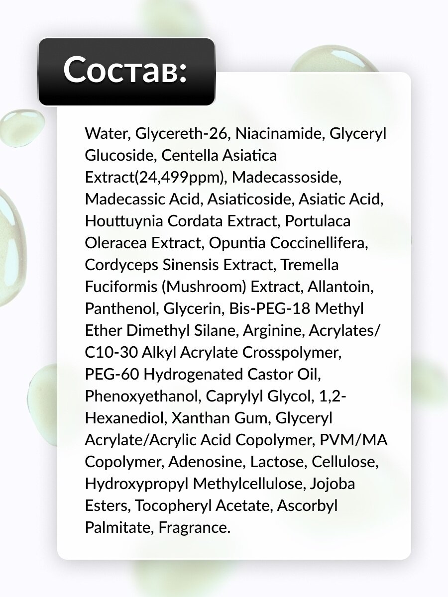 | Активный ингредиент | экстракт центеллы азиатской, мадекассосид, экстракт портулака, экстракт опунции, экстракт тремеллы, аллантоин, пантенол |